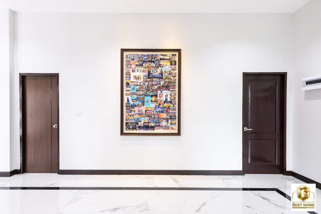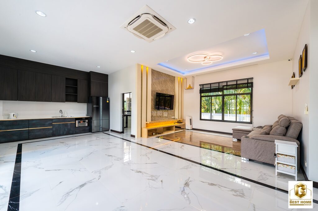 เข้ามาชมการตกแต่งภายในกันเลย เริ่มจากห้องโถงกันก่อน จะเห็นได้ว่ามีความหรูหรา โปร่งโล่ง ยืนพื้นด้วยโทนสีขาว แต่แฝงไปด้วยบรรยากาศอบอุ่น โดยมีการจัดโซนห้องครัวและโซนห้องนั่งเล่นไว้ในห้องเดียวกันแต่แบ่งสัดส่วนการใช้งานอย่างชัดเจน