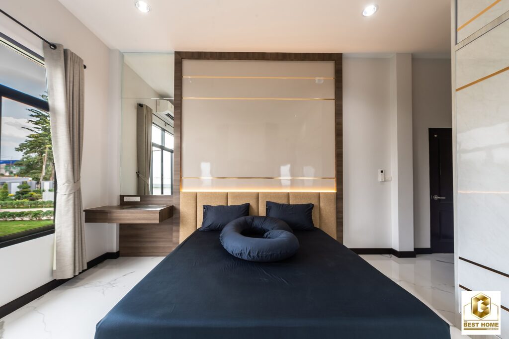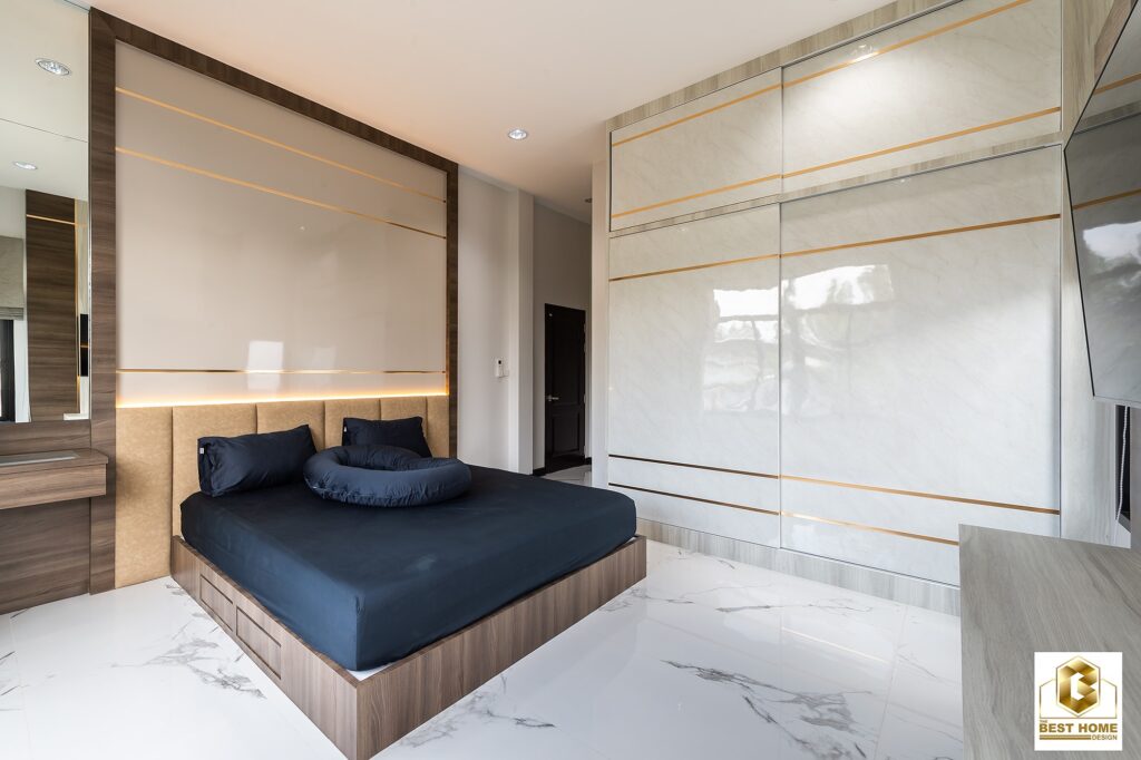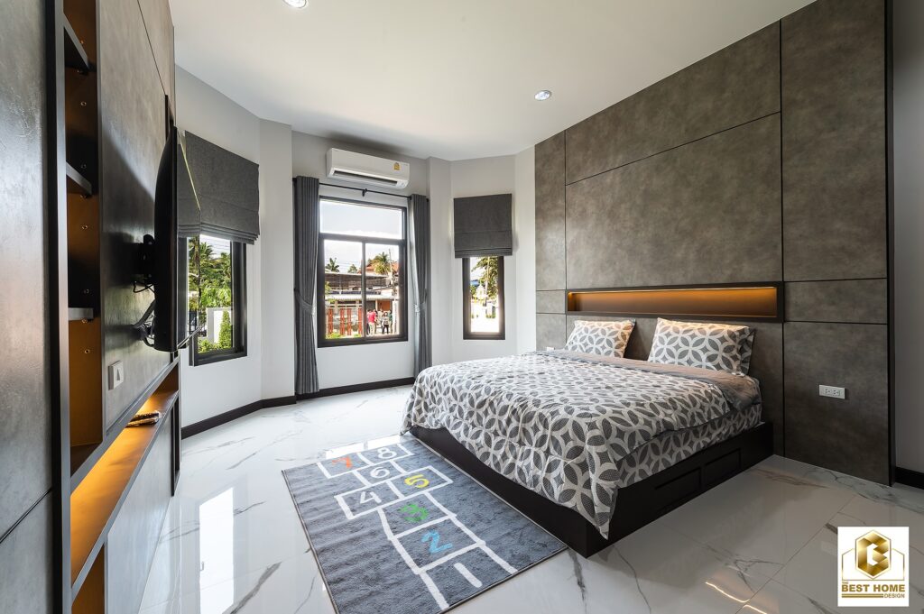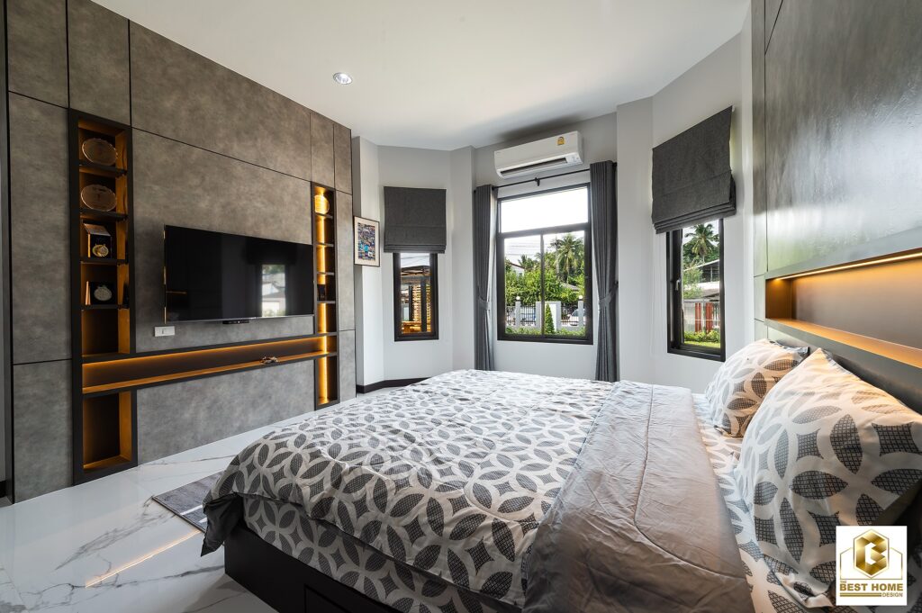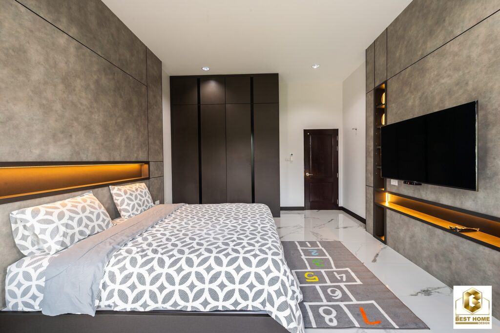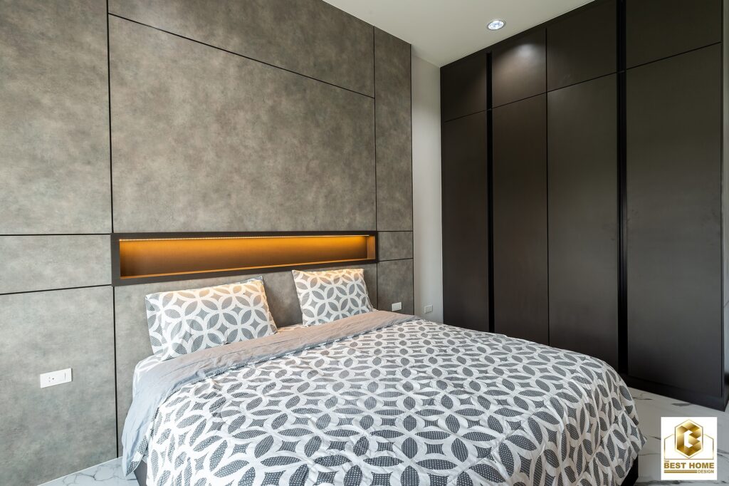สำหรับห้องนอนห้องนี้เป็นห้องที่เน้นโทนสีเทาด้วยผนังลายปูนเปลือย มีโทนสีทองจากไฟซ่อนบิวท์อินเสริมเข้ามาเล็กน้อย