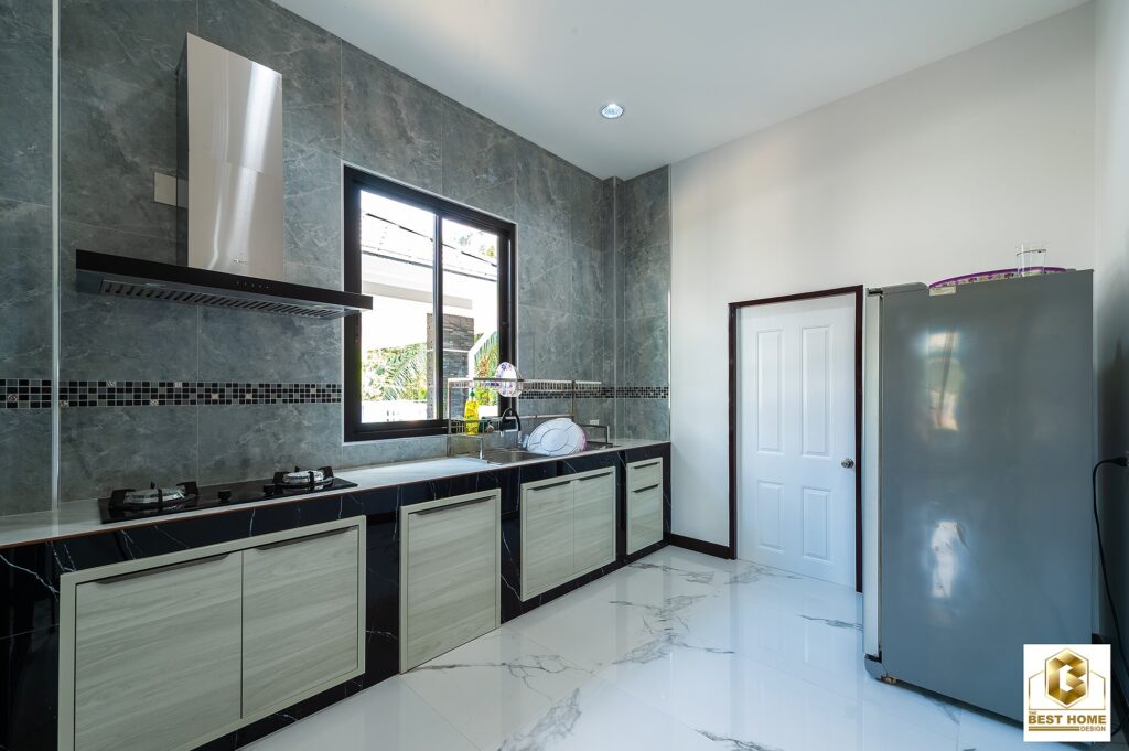สำหรับห้องครัว ตกแต่งโดยเน้นโทนสีขรึมอย่างสีเทาของผนังกระเบื้องลายหินธรรมชาติ พื้นลายหินอ่อน เคาน์เตอร์ครัวหินอ่อนสีดำ พร้อมด้วยฟังก์ชันในครัวครบครันไม่ว่าจะเป็นที่ดูดควัน เตาไฟฟ้า และซิงก์ล้างจาน
