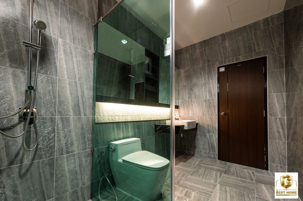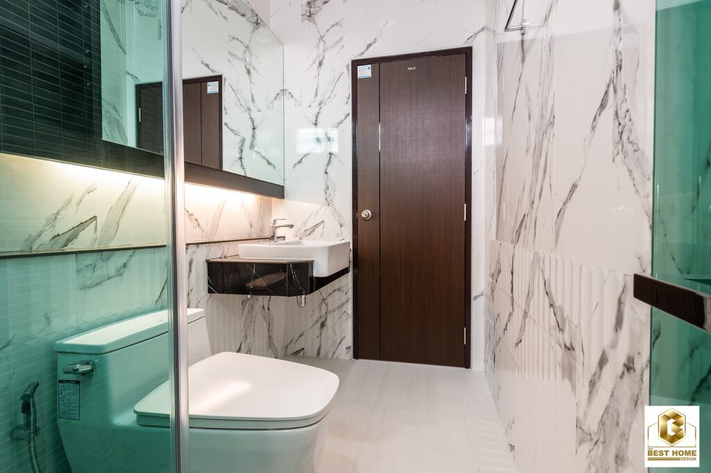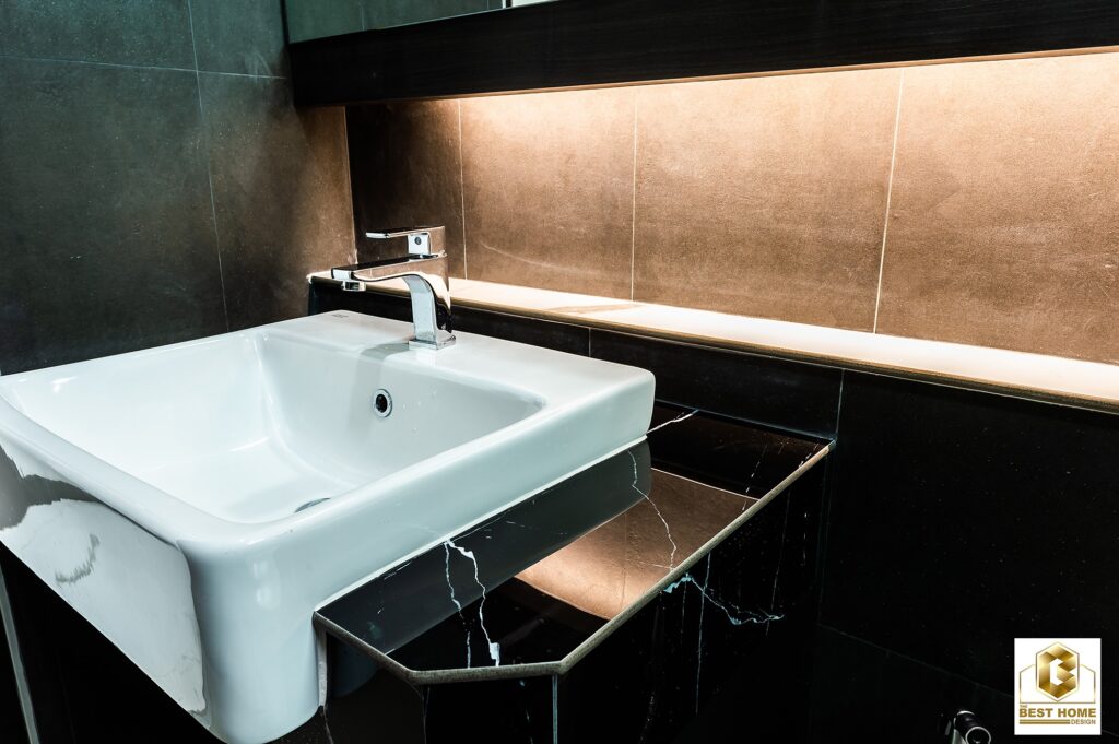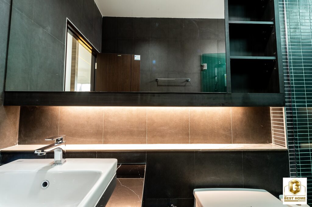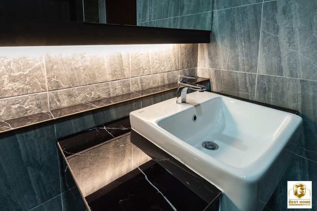 การตกแต่งห้องน้ำแต่ห้องนั้น จะมีความแตกต่างที่โทนสีและวัสดุ แต่เน้นความหรูหราเหมือนกันทุกห้อง อย่างห้องนี้เลือกใช้โทนสี แทรกไปด้วยโทนสีเทา และลวดลายศิลปะของผนังห้องเป็นจุดเด่น