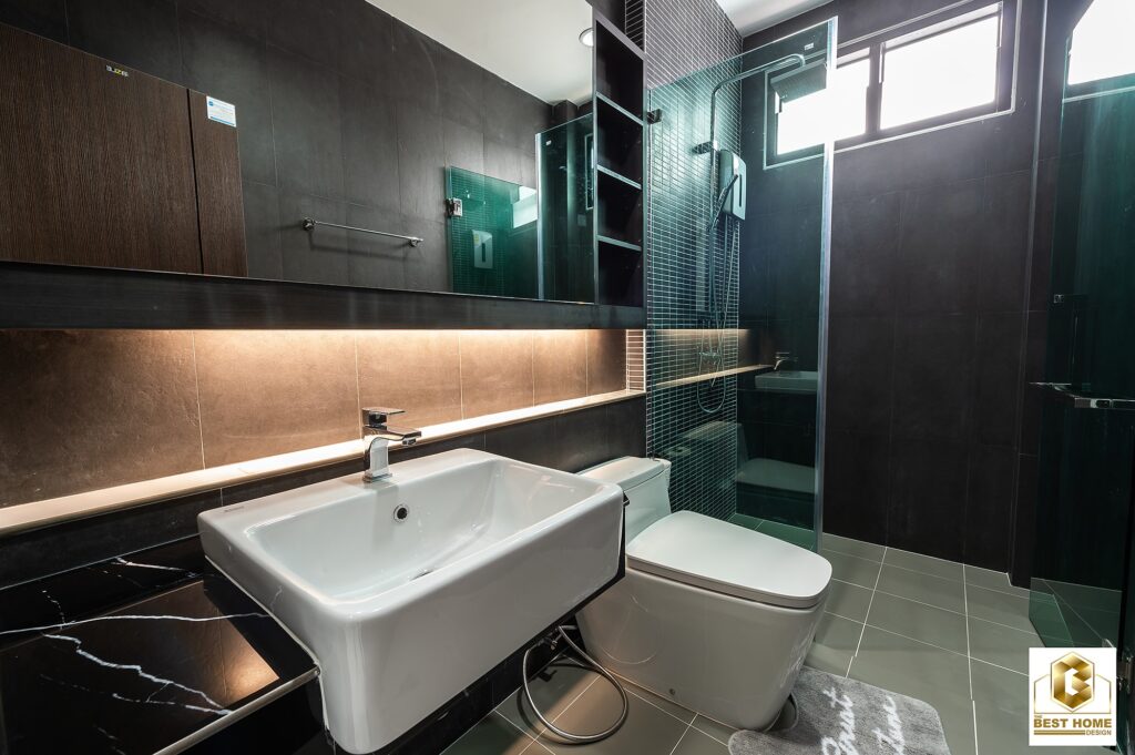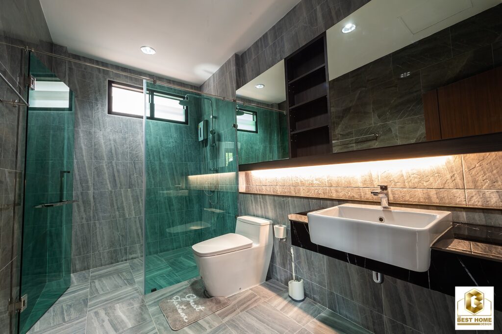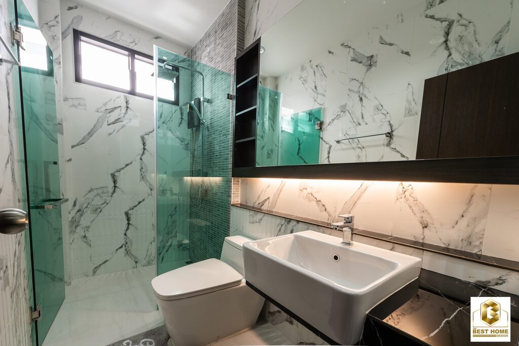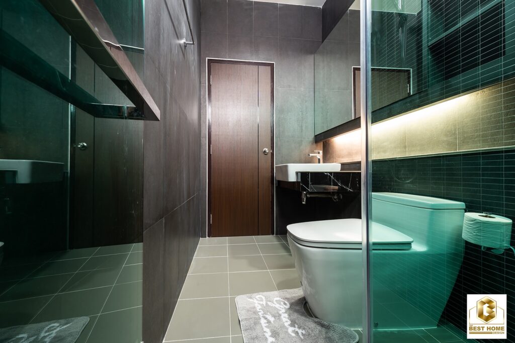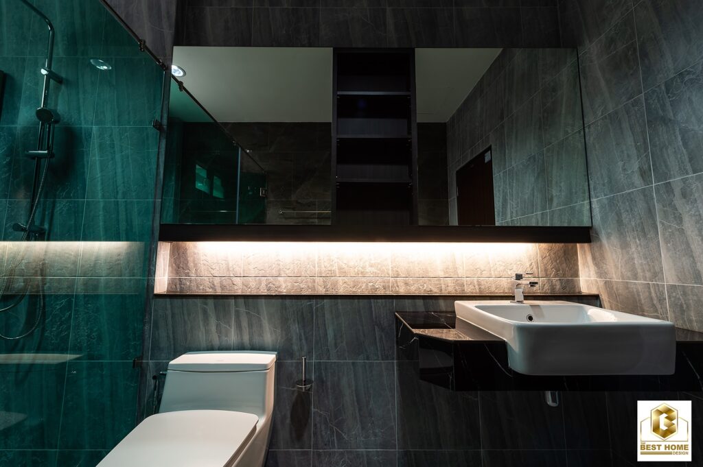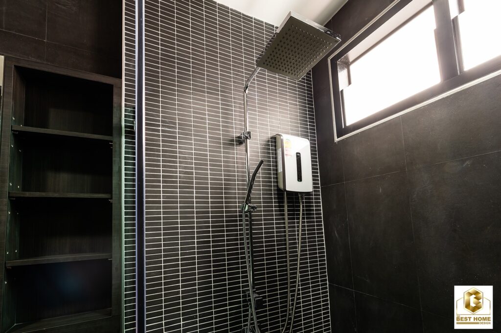 การตกแต่งห้องน้ำแต่ห้องนั้น จะมีความแตกต่างที่โทนสีและวัสดุ แต่เน้นความหรูหราเหมือนกันทุกห้อง อย่างห้องนี้เลือกใช้โทนสี แทรกไปด้วยโทนสีเทา และลวดลายศิลปะของผนังห้องเป็นจุดเด่น