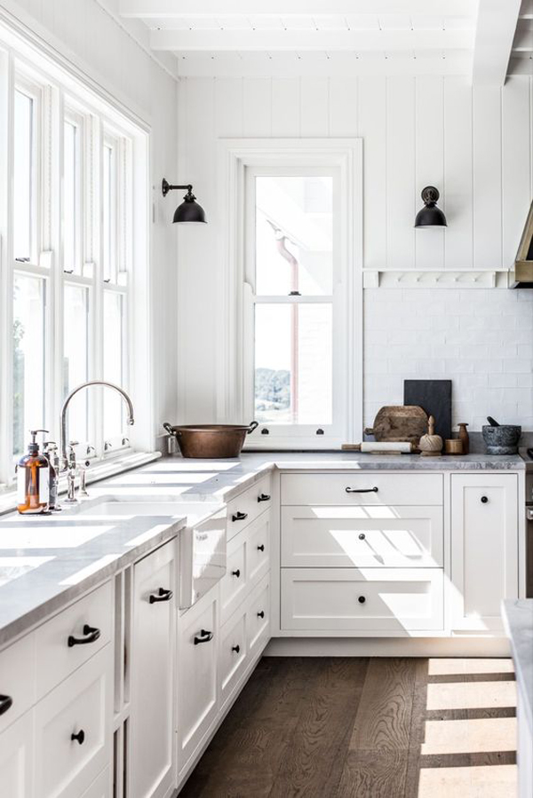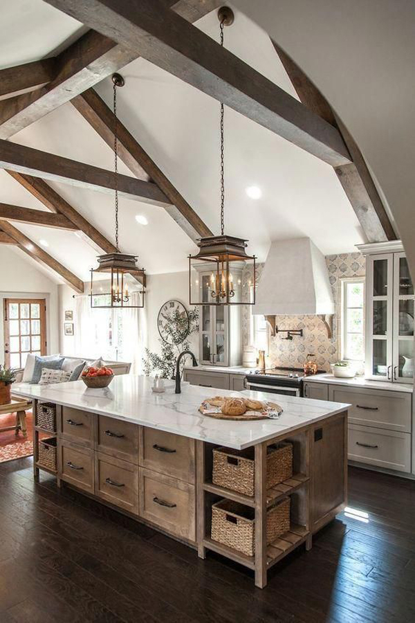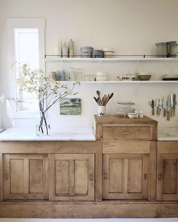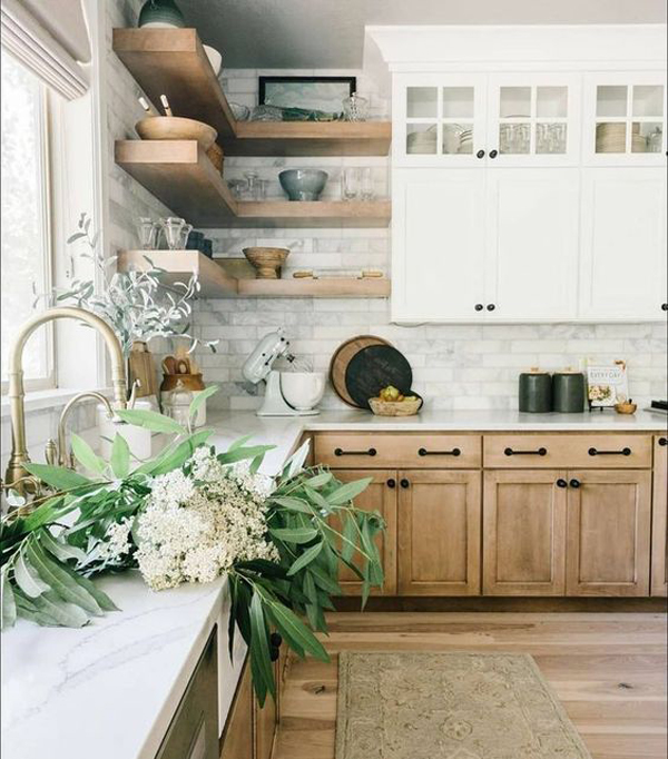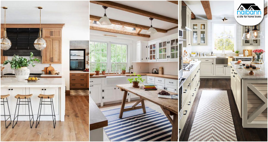 สำหรับห้องครัวสไตล์ฟาร์มเฮ้าส์นั้น จะเน้นใช้ของตกแต่งและวัสดุที่มีความเก่า ให้กลิ่นอายแบบวินเทจ โดยส่วนประกอบที่จะขาดไม่ได้เลยก็คือ ไม้ นั่นเอง แนะนำให้ใช้ไม้เก่าแบบไม่ขัดสีหรือปรุงแต่งใด ๆ จะทำให้ได้บรรยากาศที่อบอุ่นและดูมีเรื่องราวความทรงจำแฝงซ่อนไว้ในลวดลายที่ผ่านการใช้งาน