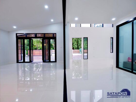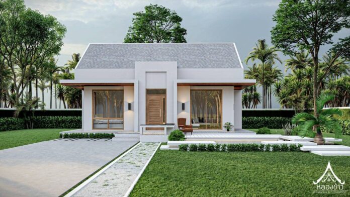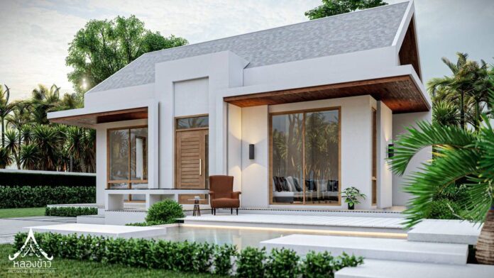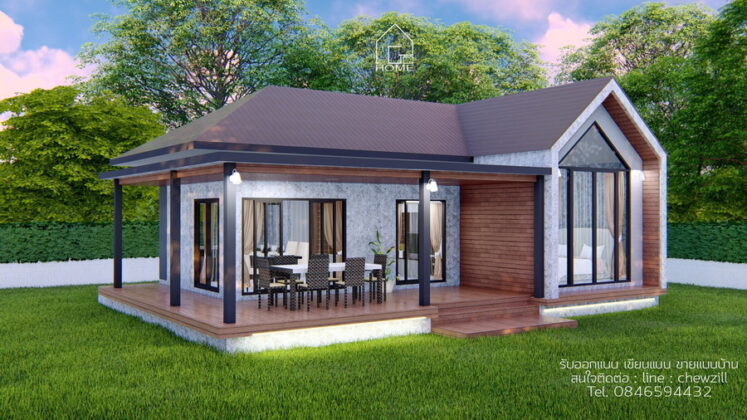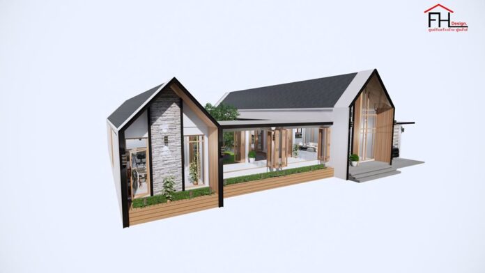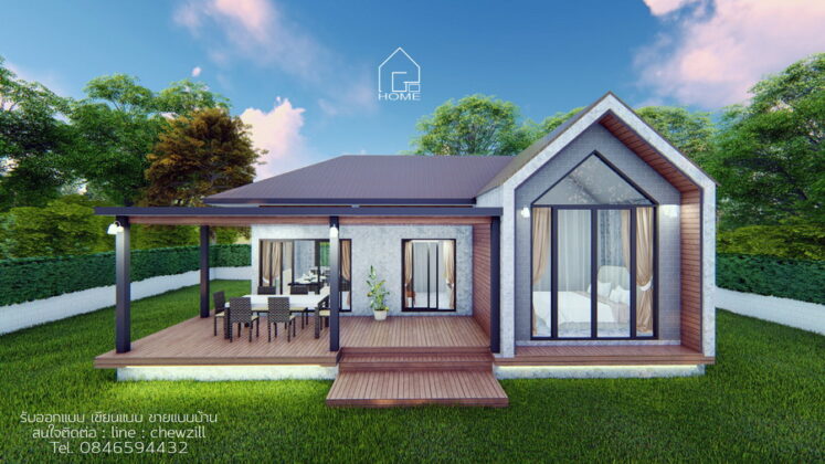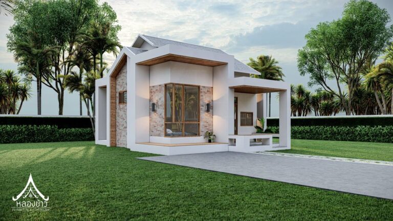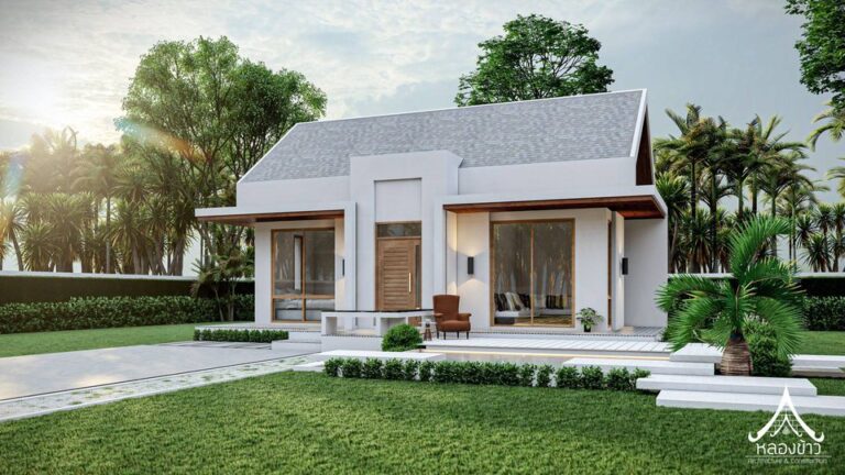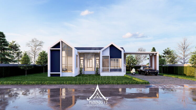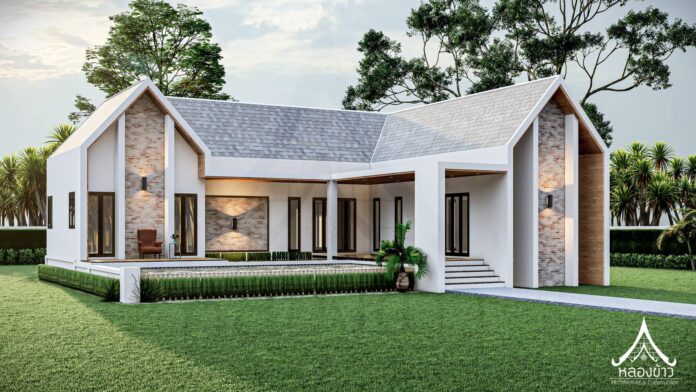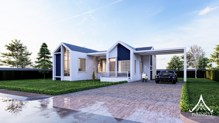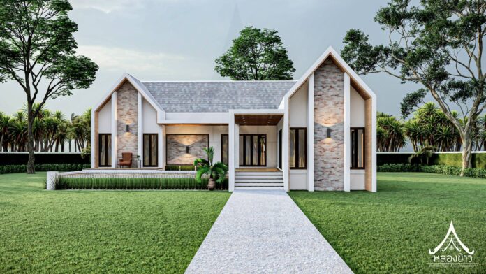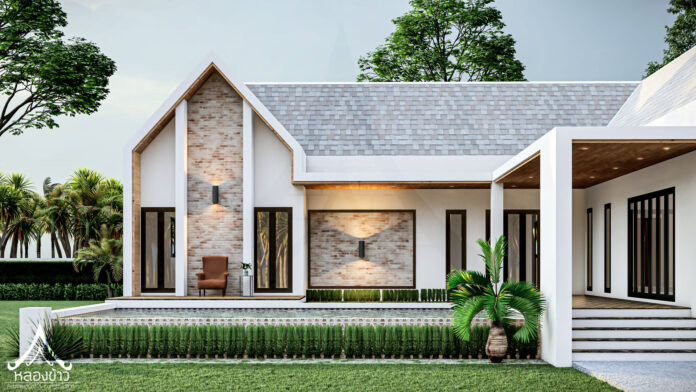 6. แบบบ้านชั้นเดียวสไตล์นอร์ดิกผสานการออกแบบไทยประยุกต์ 3 ห้องนอน 2 ห้องน้ำ พร้อมเฉลียงกว้าง พื้นที่ 102 ตร.ม.