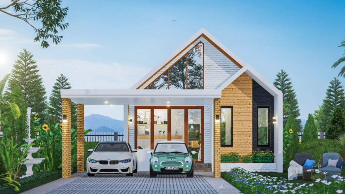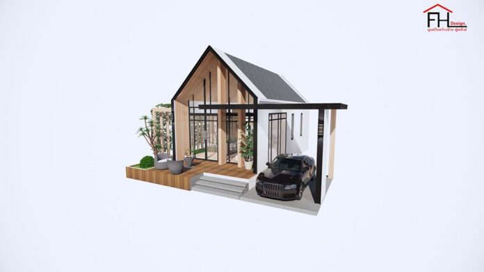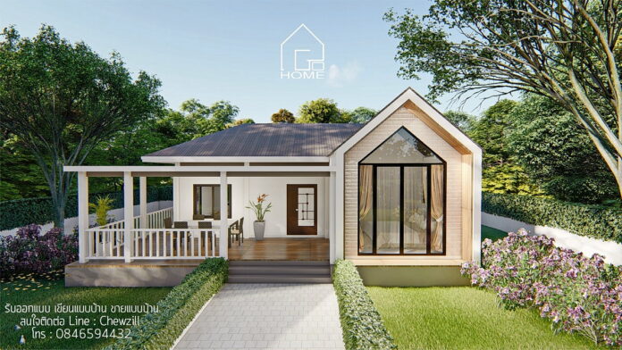 1. แบบบ้านชั้นเดียวสไตล์นอร์ดิก โทนสีขาว ฟาซาดทรงจั่ว ผนังไม้ 2 ห้องนอน 2 ห้องน้ำ พื้นที่ 100 ตร.ม.