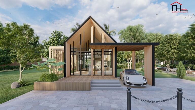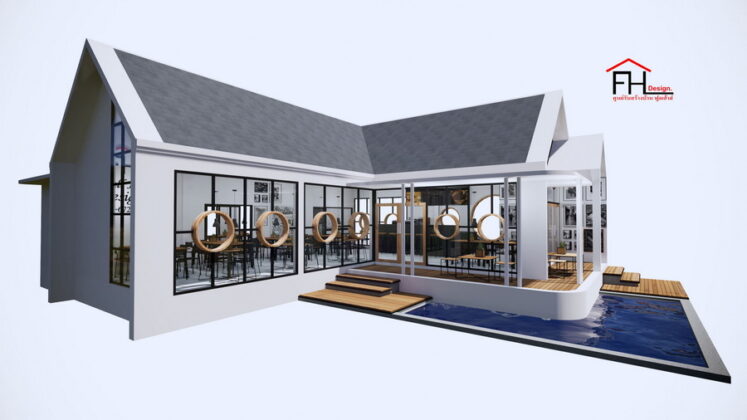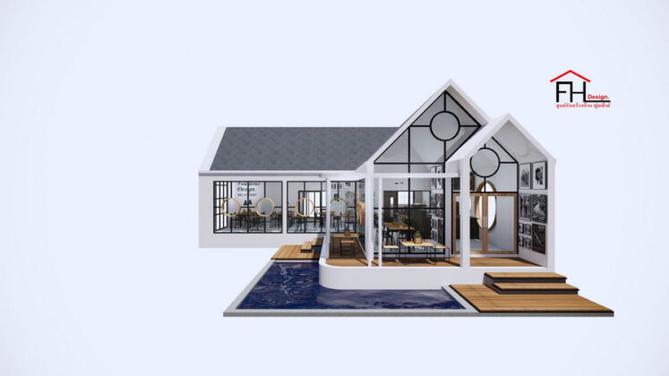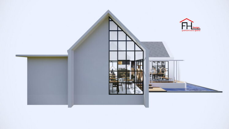 22. แบบบ้านพร้อมคาเฟ่สไตล์นอร์ดิก หลังคาทรงจั่ว ผนังกระจก 3 ห้องนอน 4 ห้องน้ำ พื้นที่ใช้สอย 215 ตร.ม.