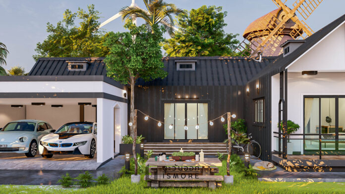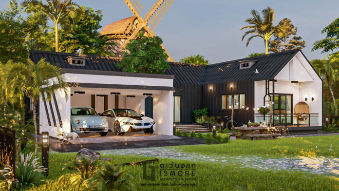 9. แบบบ้านชั้นเดียวสไตล์นอร์ดิกทรงตัวยู (U-Shaped House) โทนสีขาวดำ บรรยากาศบ้านสวน 2 ห้องนอน 3 ห้องน้ำ พื้นที่ 131 ตร.ม.