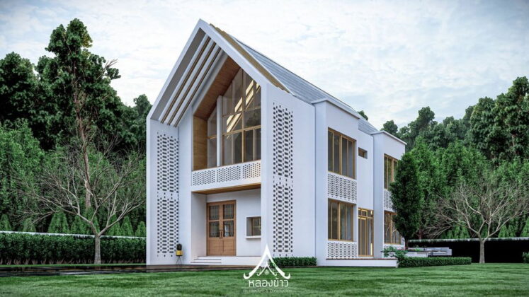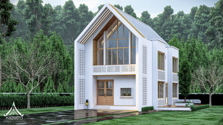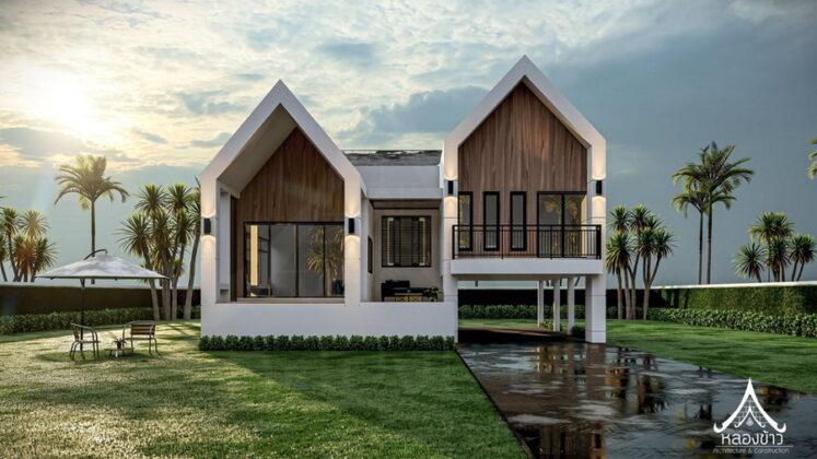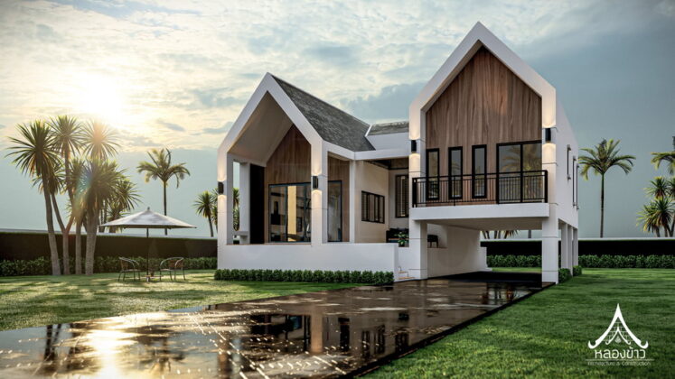2. แบบบ้านสไตล์นอร์ดิกผสมไทย ฟาซาดทรงจั่ว ระเบียงนั่งเล่น 3 ห้องนอน 2 ห้องน้ำ พื้นที่ 102 ตร.ม.