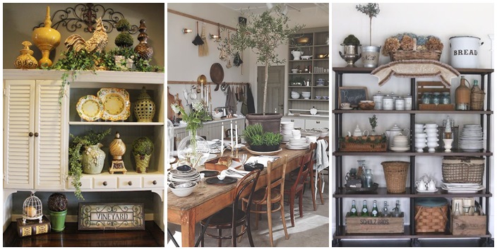 มักจะใช้งานไม้ทำเป็นเฟอร์นิเจอร์ หรือชั้นวางของ ตกแต่งด้วยแก้ว ถ้วย โหล ต่างๆ แบบวินเทจ สีขาวครีม ตกแต่งเพิ่มเติมให้โก้หรู ไปกับ เครื่องเงิน หรือทองแดง ทองเหลืองก็ได้ ดูสวยงามเข้ากันดี แทรกการตกแต่งจากไม้กระถาง ดูแต่งแต้มความเขียวขจีน่ารักที่สุด