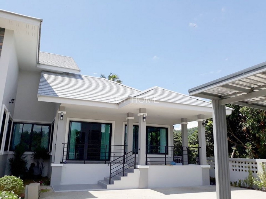 สำหรับบบ้านสไตล์คอนเทมโพรารีหลังนี้เป็นบ้านขนาดชั้นครึ่ง ตัวบ้นาออกแบบหน้ากว้าง และจากมุมนี้เราจะเห็นว่าทางด้านซ้านนั้น ตัวบ้านถูกยกใต้ถุนสูง ทำให้มีพื้นที่ใช้สอยเพิ่มขึ้นอีกด้วย ด้านการตกแต่งนั้น ตัวบ้านมีสีโทนอ่อน จึงให้บรรยากาศที่สบายตา มีหลังคาทรงปั้นหยาที่มุงด้วยกระเบื้องแบบเรียบ