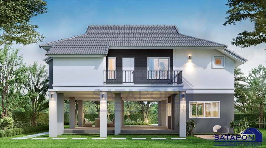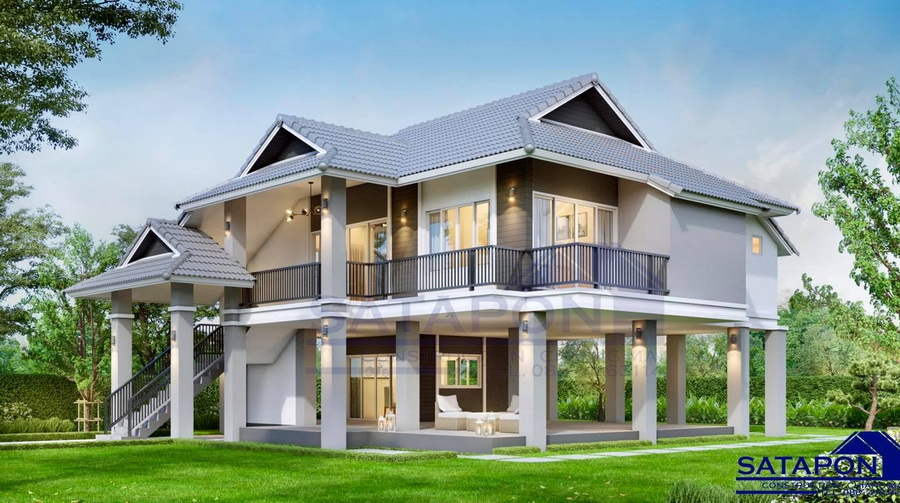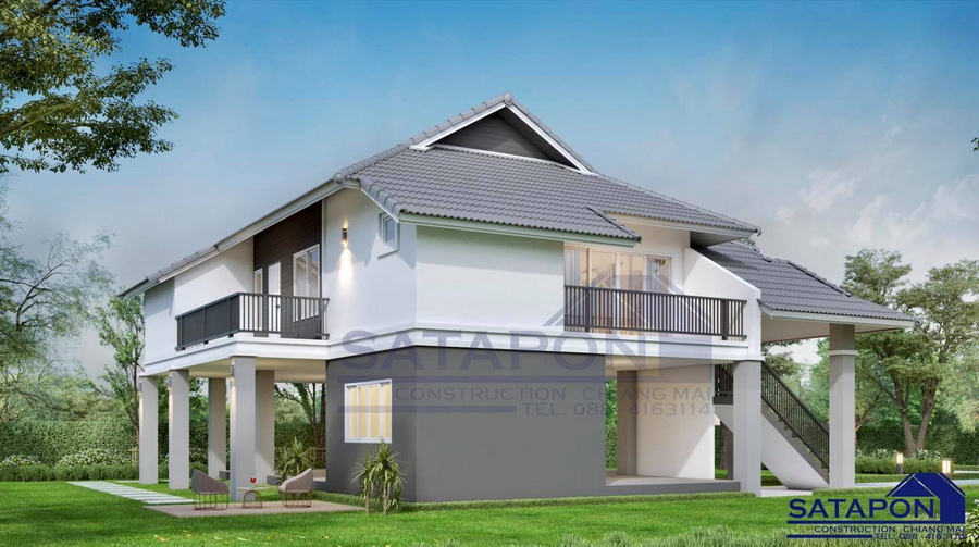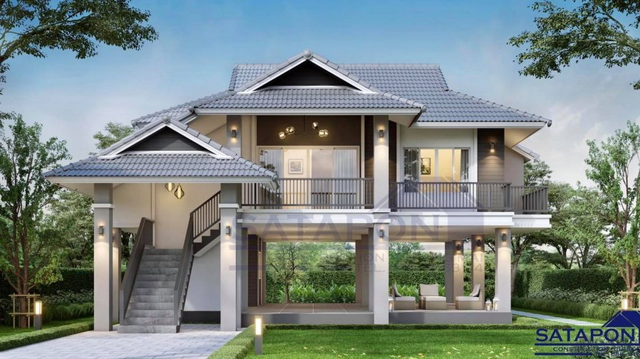 แบบบ้านหลังนี้เป็นบ้านชั้นเดียวที่ถูกยกใต้ถุนขึ้นสูง ตัวบ้านมีพื้นฐานการออกแบบก่อสร้างด้วยวัสดุสมัยใหม่ที่ให้ความเป้นบ้านร่วมสมัยที่มีความสวยงามแข็งแรง ด้านรายละเอียดการตกแต่งนั้น หลังคาบ้านเป็นแบบทรงมะนิลาที่มีชายคากว้าง จึงช่วยป้องกันแดดและฝนได้เป็นอย่างดี