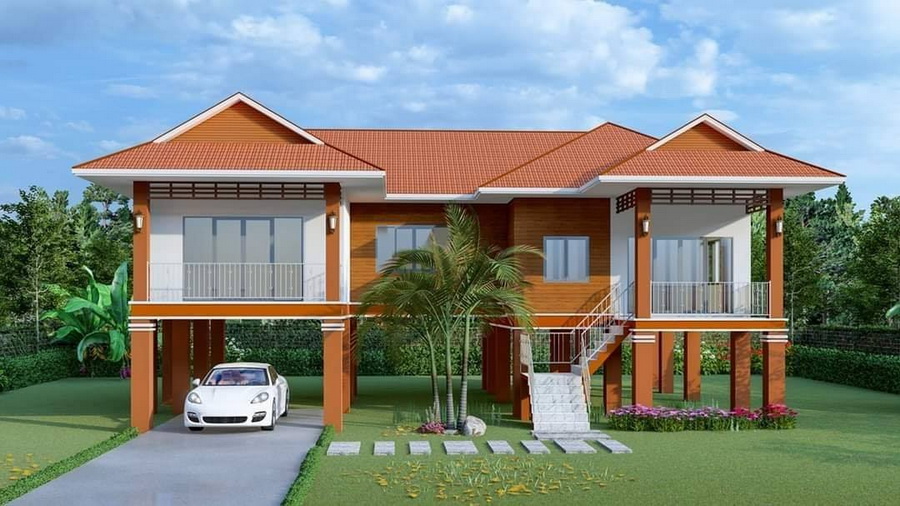 แบบบ้านทรงไทยประยุกต์ ออกแบบใต้ถุนยกสูง 3 ห้องนอน 3 ห้องน้ำ พื้นที่ใช้สอย 267 ตร.ม.