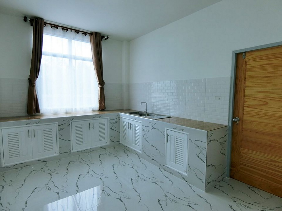 ภายในห้องครัวยังคงรูปแบบการตกแต่งด้วยกระเบื้องลายหินอ่อน พร้อมกับมีเคาน์เตอร์ครัวแบบติดผนังที่ช่วยอำนวยความสะดวกได้เป็นอย่างดี
