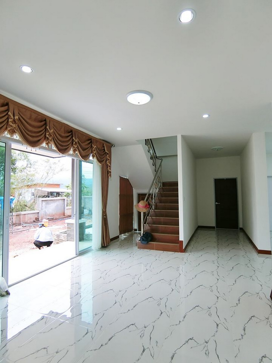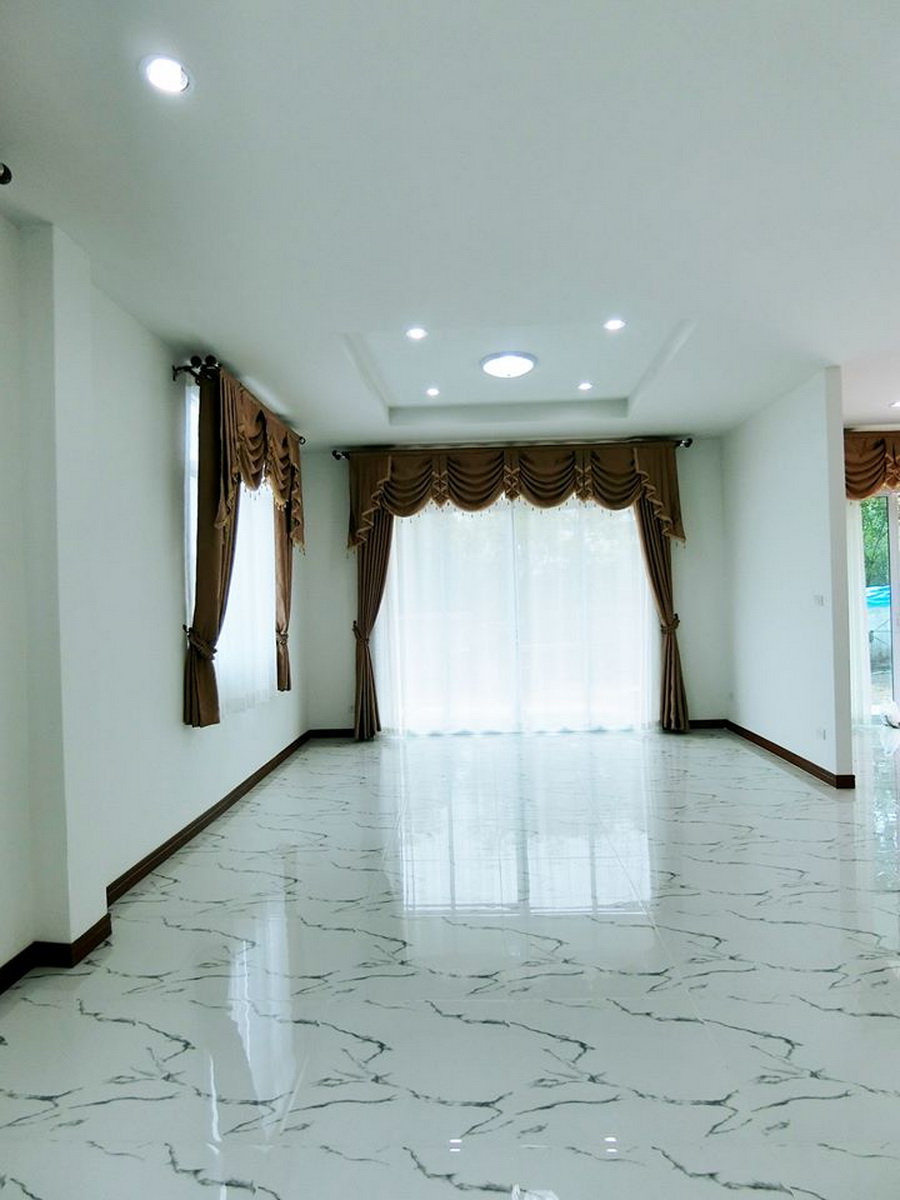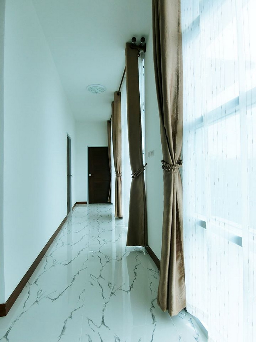 เมื่อเข้ามาภายในบ้าน เราจะพบกับพื้นที่ห้องโถงหลักของบ้านที่มีพื้นที่ใช้สอยขนาดใหญ่ ภายในสวยหรูด้วยพื้นห้องที่ถูกปูด้วยแผ่นกระเบื้องลายหินอ่อน พร้อมกับผ้าม่านแบบหรูหรา
