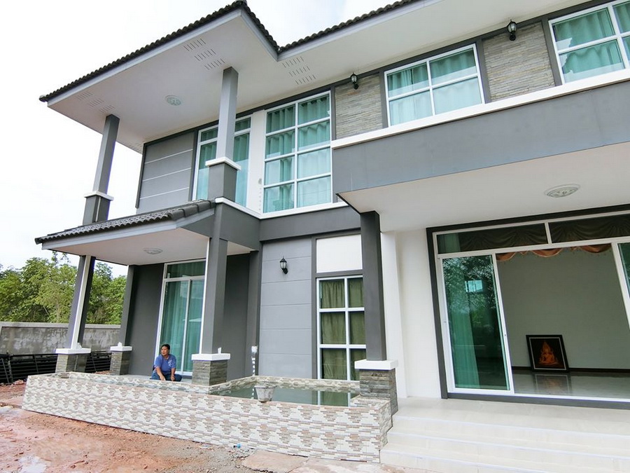 สำหรับบ้านหลังนี้เป็นบ้านขนาดชั้นเดียว ตัวบ้านถูกออกแบบในสไตล์แบบคอนเทมโพรารีที่สวยงาม มีรายละเอียดการตกแต่งที่ละเอียด หลังคาของบ้านเป้นแบบปั้นหยามุงด้วยกระเบื้องลอนสีเข้ม การตกแต่งภายนอกมีโทนสีเทายืนพื้น แซมด้วยสีครีมที่เข้ากัน