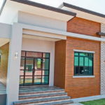 ลักษณะบ้านสองชั้น ตัวบ้านยกระดับสูงจากพื้น ดีไซน์ทรงกล่องสี่เหลี่ยม หลังคาทรงเพิงหมาแหงน ตกแต่งภายนอกด้วยโทนสีขาวบริเวณผนังและโทนสีเทาในส่วนของฐานบ้าน เสริมด้วยรายละเอียดของผนังลวดลายไม้ที่ชั้นแรก มาพร้อมกับพื้นเฉลียงไม้รอบบ้าน
