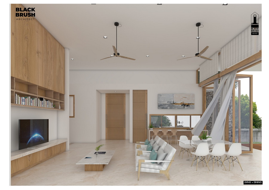 เมื่อเข้ามาภายในบ้าน เราจะพบกับห้องโถงหลักของบ้าน ซึ่งมีพื้นที่ใช้สอยที่กว้างเป็นพิเศษ ภายในแบ่งพื้นที่การใช้สอยเป็นทั้งห้องนั่งเล่นและห้องรับประทานอาหาร