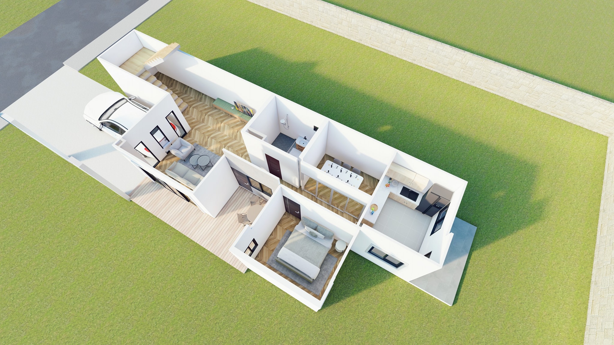 แบบบ้านสไตล์โมเดิร์น ผลงานการออกแบบโดย Design&Construction เป็นบ้านหน้าแคบที่เหมาะกับที่ดินขนาดเล็ก การดีไซน์เน้นไปที่รูปทรงที่ทันสมัยในแบบเรขาคณิต เหมาะกับไลฟ์สไตล์ของคนยุคใหม่ที่ต้องการบ้านที่มีความสวยงามทันสมัย