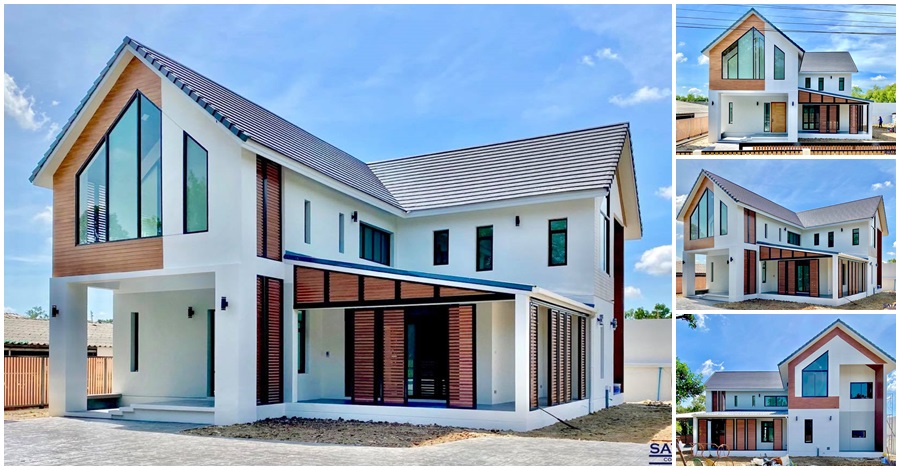 แบบบ้านสองชั้นสไตล์โมเดิร์นบาร์น หลังคาทรงจั่ว กับรูปทรงเส้นสายที่มีเอกลักษณ์