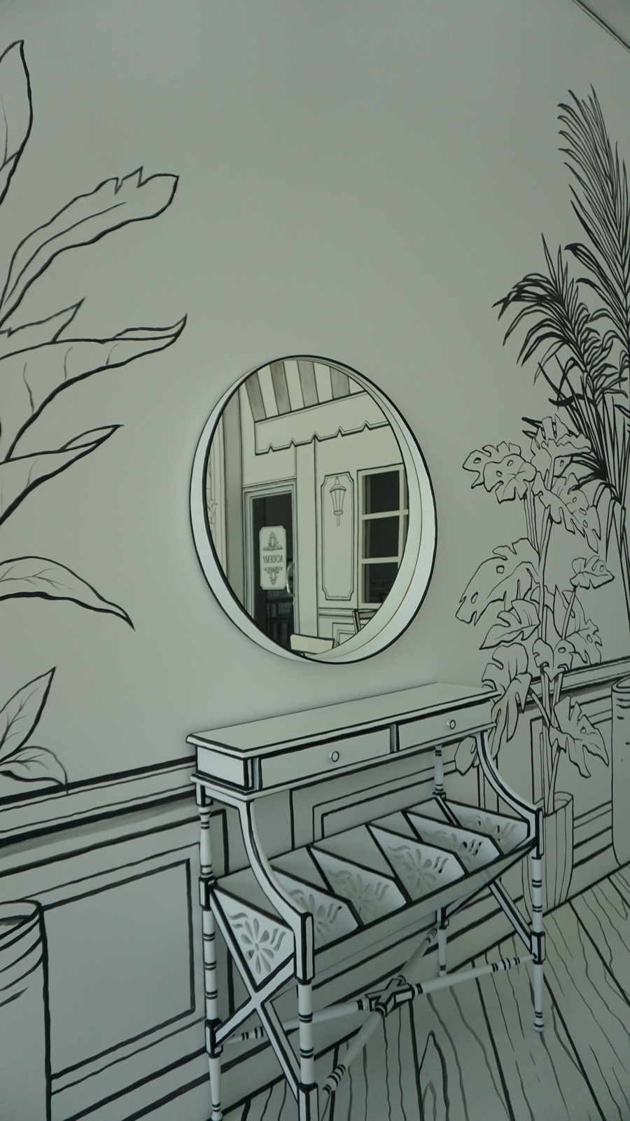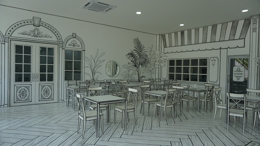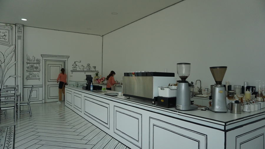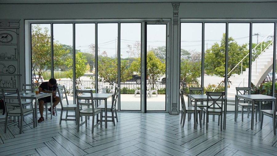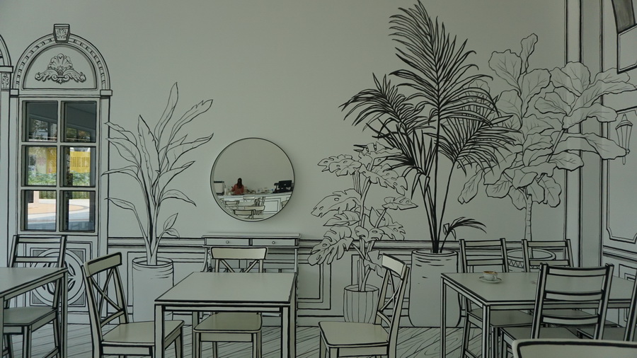 ภายในคาเฟ่ จะทำให้เรารู้สึกตะลึงในความสวยงามแปลกตาได้ ด้วยการออกแบบด้วยการวาดภาพลายเส้นแบบขาวดำ ทำให้เรามองเห็นทุกพื้นที่เป็นแบบ 2 มิติ