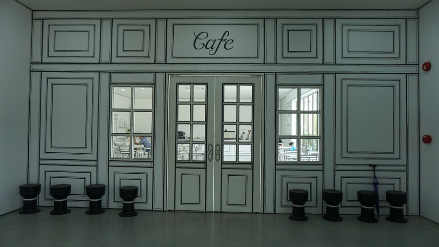 เมื่อเราเข้ามาด้านในตัวอาคาร เราก็จะพบกับปประตูทางเข้าคาเฟ่ 2D ซึ่งโดดเด่นสะดุดตาเรามาแต่ไกลด้วยการออแบบเป็นแบบภาพเขียนขาวดำ