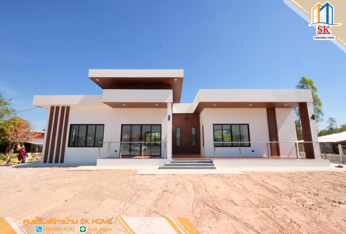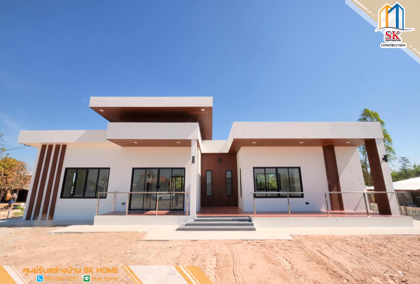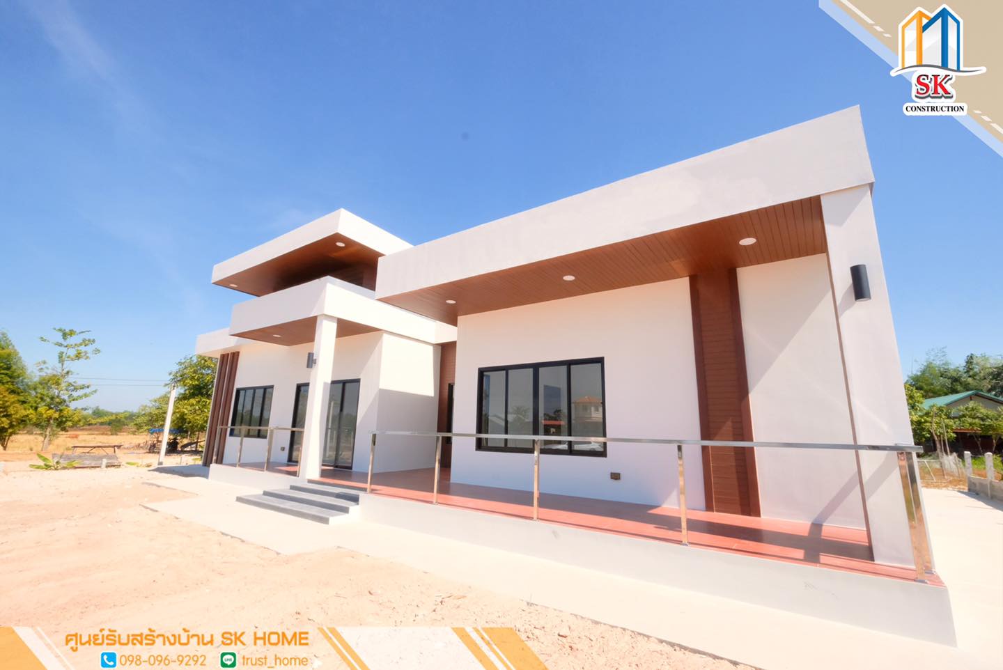 บ้านสไตล์โมเดิร์น ผลงานการออกแบบและก่อสร้างโดย SK Home เป็นบ้านพักอาศัยขนาดชั้นเดียว ซึ่งมีดีไซน์ที่ทันสมัยสวยงาม ตอบโจทย์ทั้งด้านดีไซน์ และการใช้งานที่ดีเยี่ยม