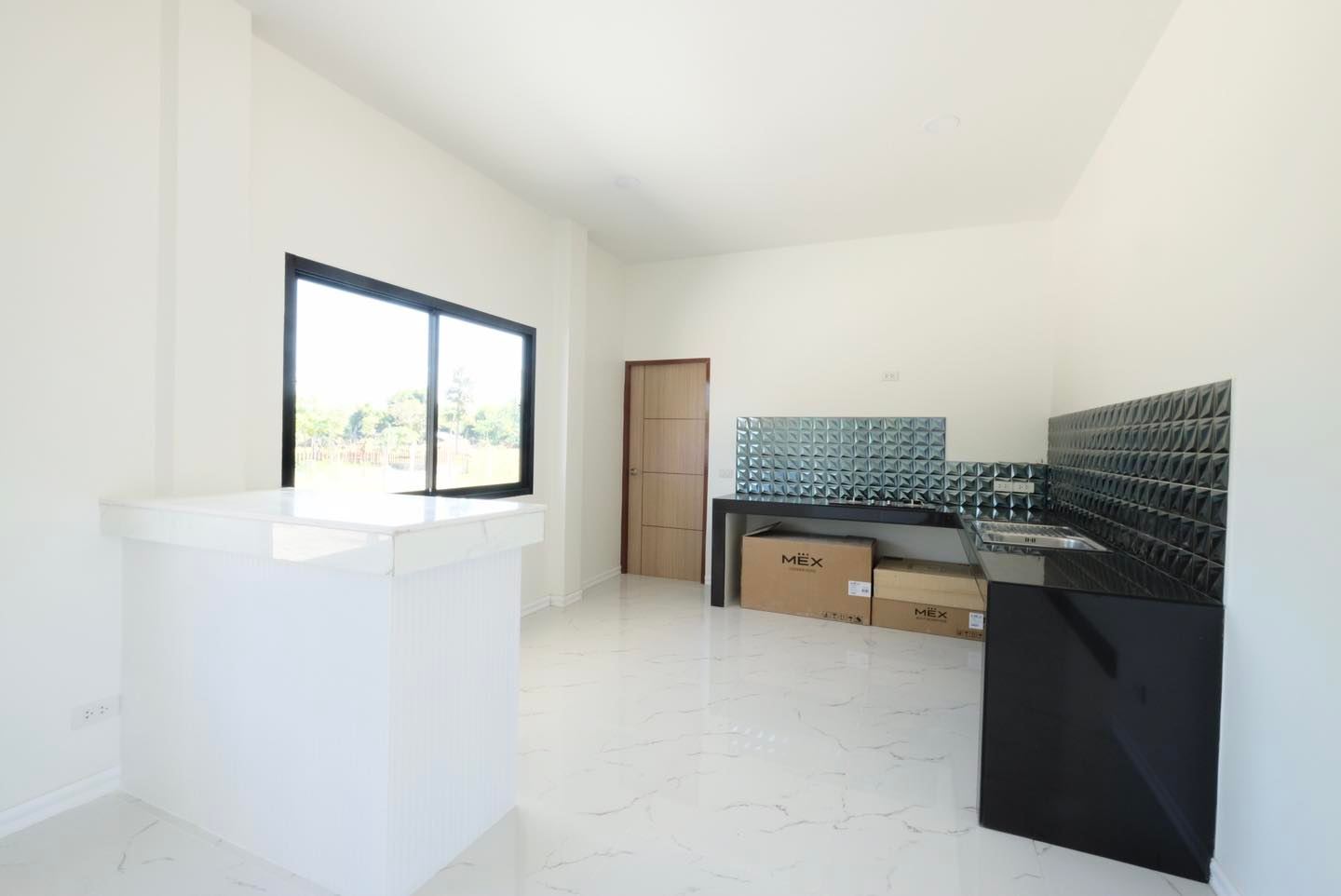 ในส่วนของห้องครัวก็มีพื้นที่ใช้สอยที่กว้างพอสมควร ซึ่งถ้าอยากจะทำอาหารไทยแบบเต็มรูปแบบ ก็อาจจะต้องมีการติดตั้งที่ดูดควันเพิ่มเติม