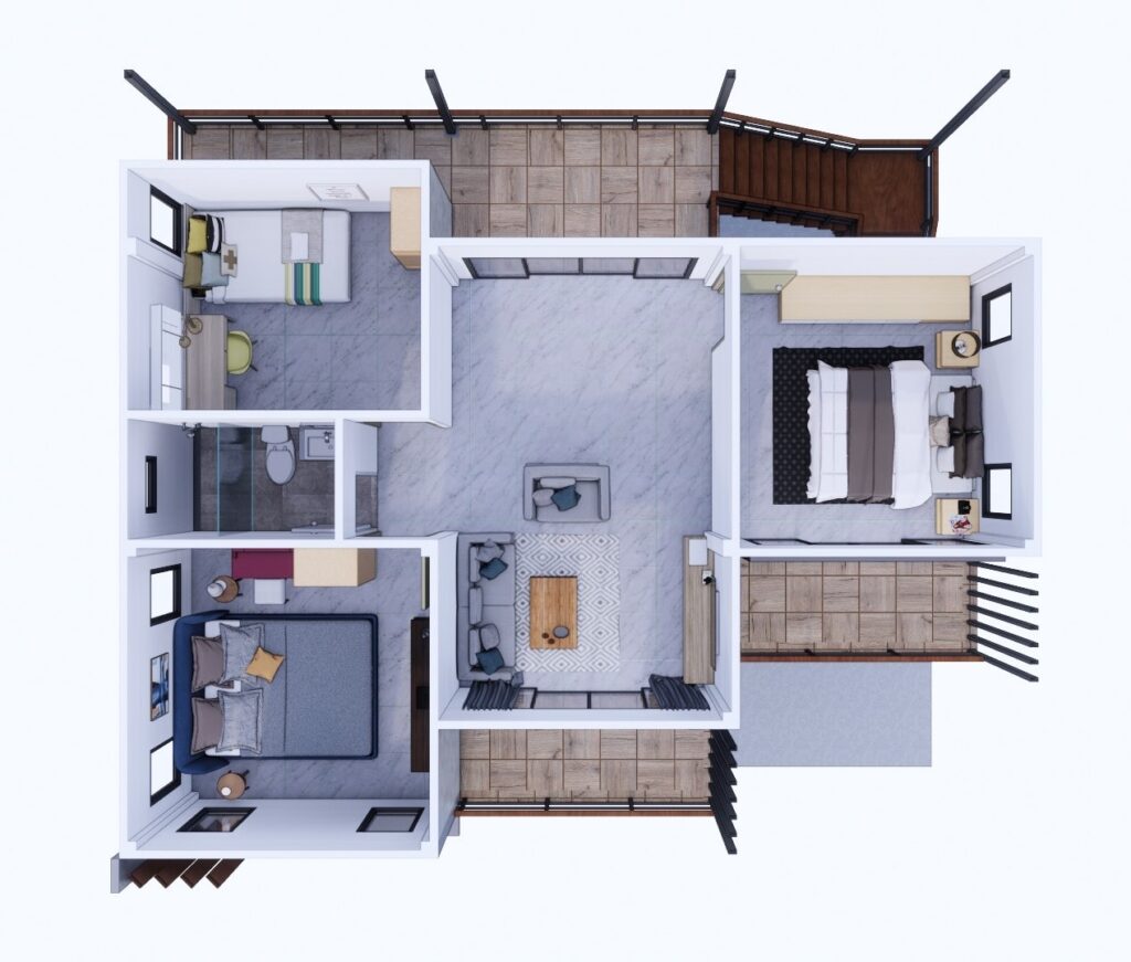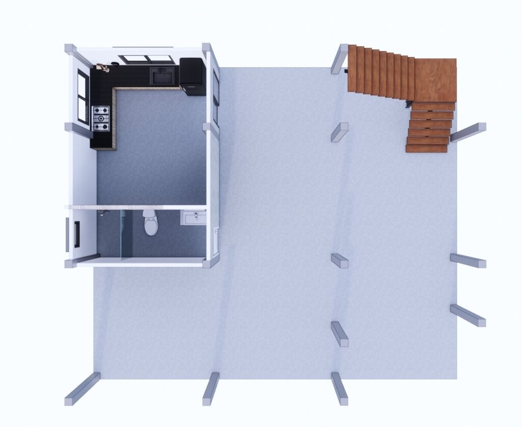 ลักษณะตัวบ้านสองชั้นยกพื้นสูง โดยชั้นล่างนั้นจะเป็นใต้ถุนโล่งประกอบไปด้วยห้องครัวและห้องน้ำ ส่วนชั้นสองนั้นจะเป็นพื้นที่อยู่อาศัยที่ประกอบไปด้วยห้องโถง(นั่งเล่น) ห้องนอน และห้องน้ำ