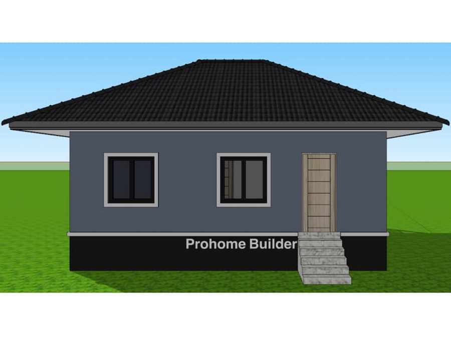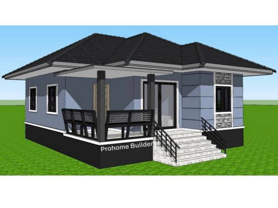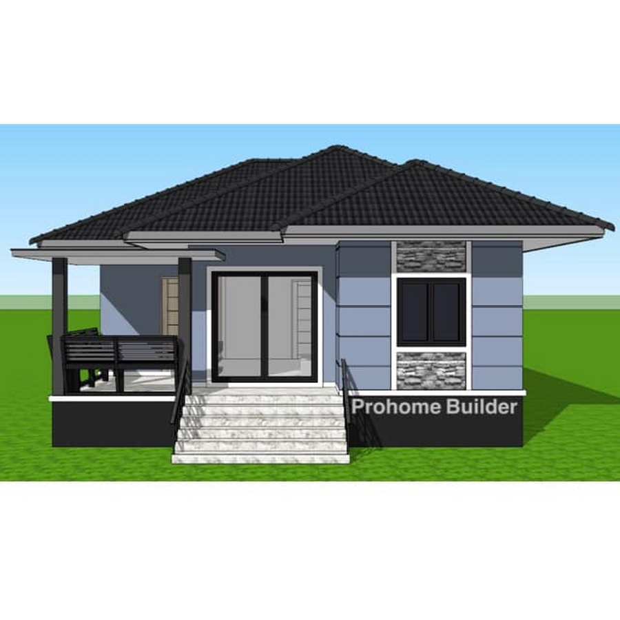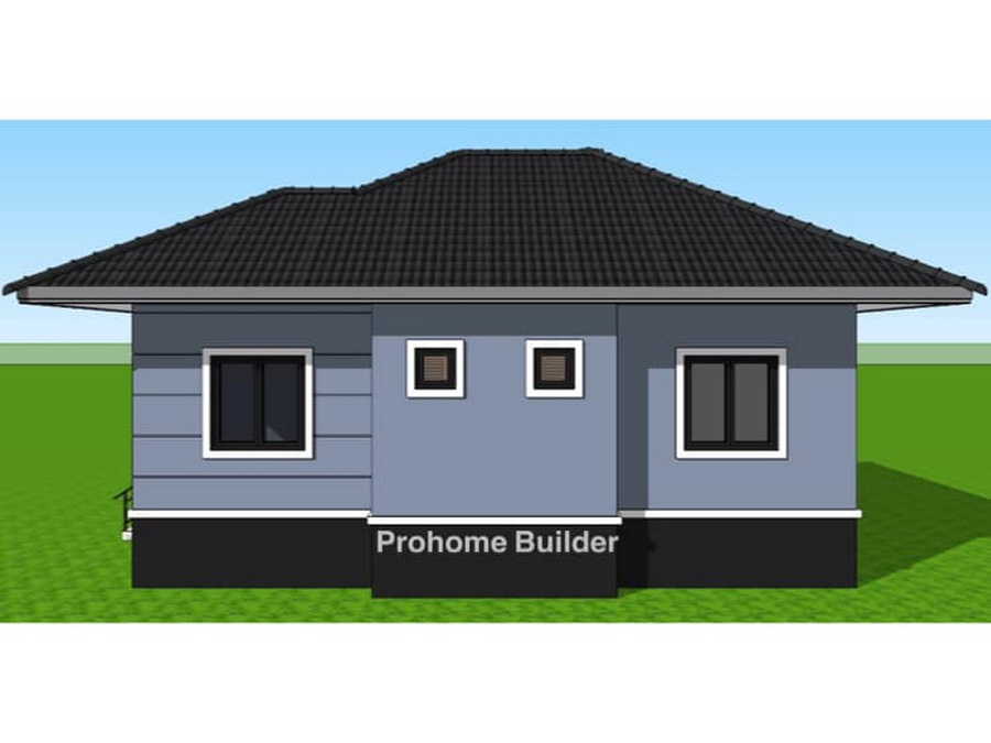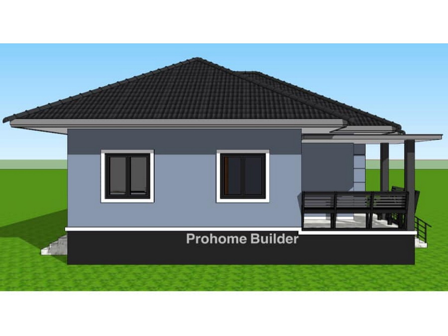 แบบบ้านหลังนี้เป็นบ้านขนาดชั้นเดียว ฐานของบ้านถูกยกขึ้นสูง ตัวบ้านออกแบบด้วยสไตล์คอนเทมโพรารีที่สวยงามทันสมัย ผนังภายนอกถูกตกแต่งด้วยสีเทาอมฟ้า ตัดขอบด้วยสีขาว หลังคาของบ้านเป็นหลังคาทรปั้นหยาที่มุงด้วยกระเบื้องลอนสีเข้ม