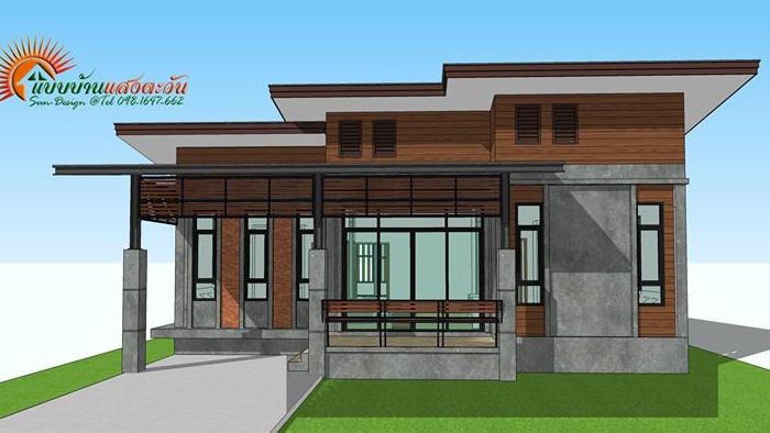 บ้านหลังนี้เป็นผลงานการออกแบบจาก แบบบ้าน ช่างตะวัน ลักษณะเป็นบ้านชั้นเดียวยกพื้นสูงเล็กน้อย โครงสร้างบ้านคอนกรีตรูปทรงเรขาคณิต ผนังก่ออิฐฉาบปูนตกแต่งสไตล์คอนกรีตเปลือย ผสมผสานไปกับวัสดุไม้สีเข้ม มุงหลังคาทรงเพิงหมาแหงนเล่นระดับ สะท้อนดีไซน์ทันสมัยสวยงาม