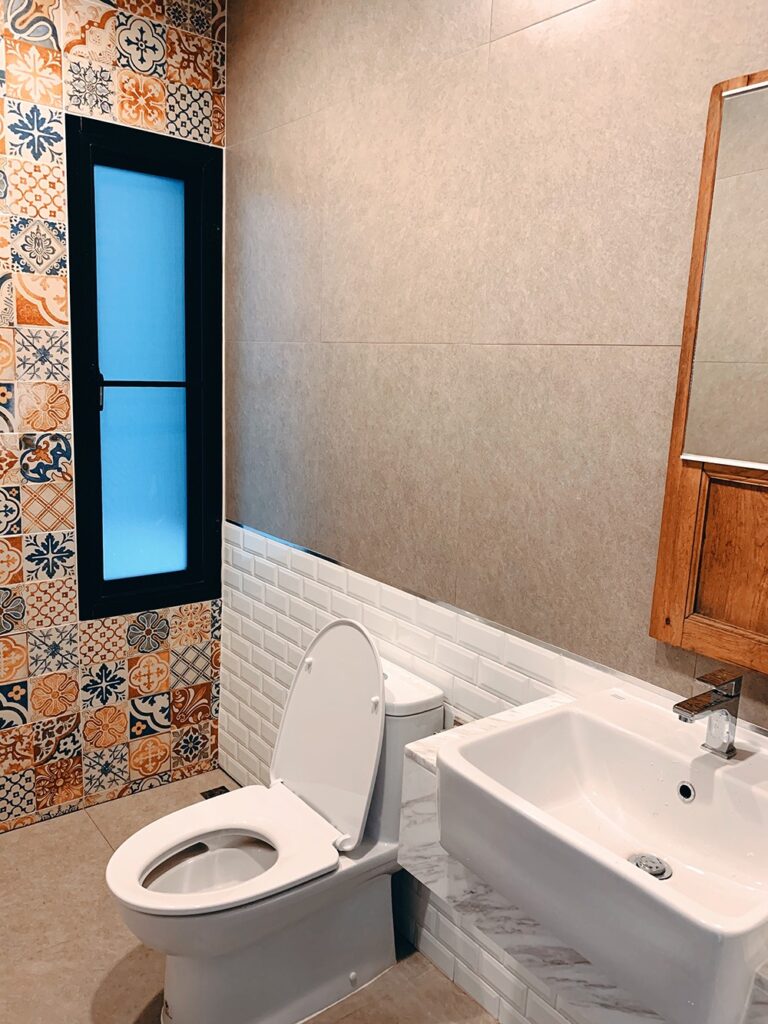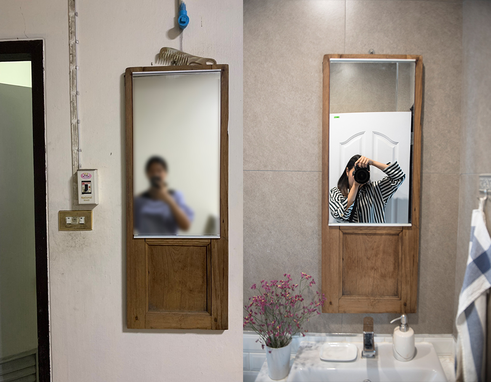 สำหรับห้องนี้เราเพิ่มโจทย์ให้ผู้รับเหมาไปอีกด้วยกระจกเก่า ก็คือต้องออกแบบให้กระจกนี้เข้ากับห้องน้ำด้วยจ้า