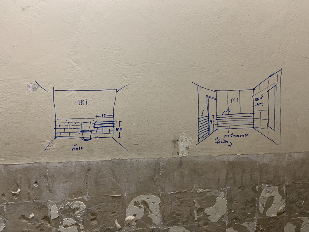 เทคนิคนึงที่อยากแชร์ก็คือ ผรม. วาดรายละเอียดไว้ที่ห้องน้ำแต่ละห้องเลย กำหนดตำแหน่งคร่าวๆ ให้ช่างทำงานต่อได้ค่ะ