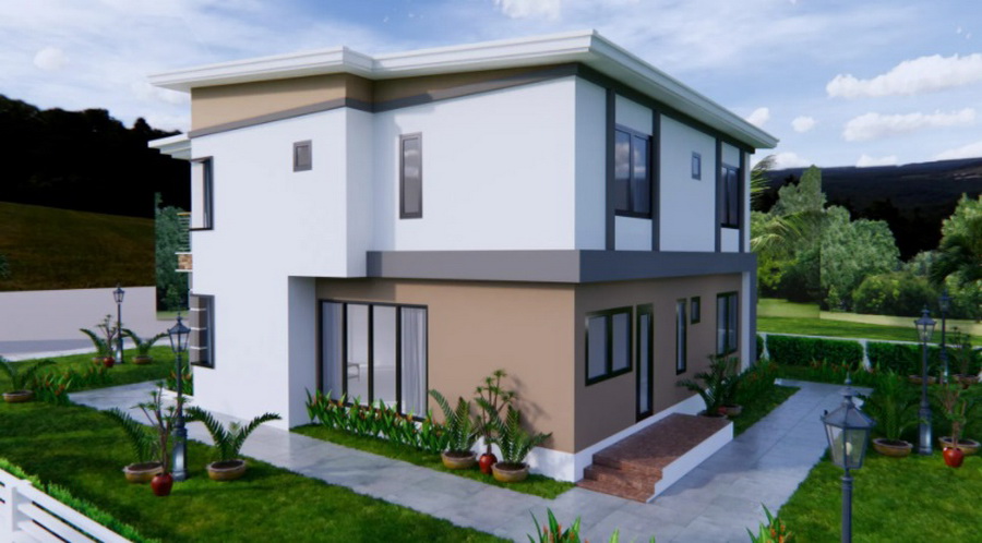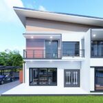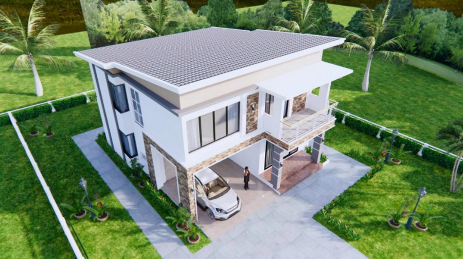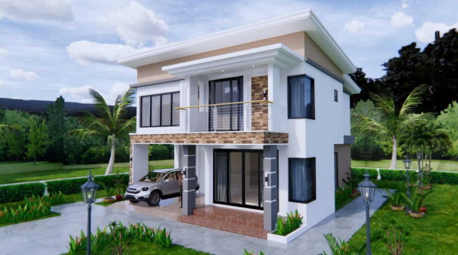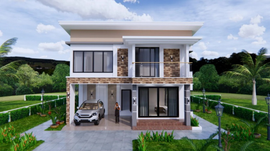 สำหรับแบบบ้านหลังนี้เป็นบ้านขนาดสองชั้น ตัวบ้านออกแบบในสไตล์โมเดิร์นที่เรียบง่ายและเราต่างคุ้นตากันดี โดยมีการเพิ่มดีเทลการตกแต่งด้วยแผ่นกระเบื้องลายหินสีน้ำตาล ผนังหลักทาด้วยสีขาวครีมทำให้บ้านดูสว่างสบายตา งานหลังคาเป็นแบบทรงเพิงหมาแหงนที่รับกับทรงสี่เหลี่ยมของบ้านได้เป็นอย่างดี