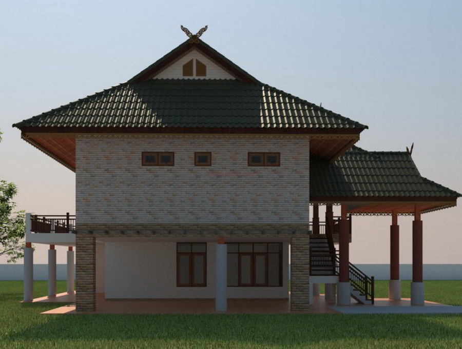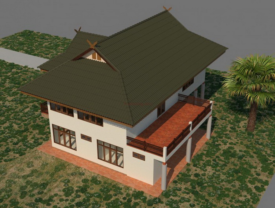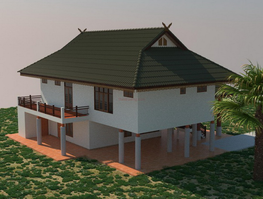 แบบบ้านสองชั้นใต้ถุนยกสูงทรงล้านนาประยุกต์หลังนี้ประกอบไปด้วย 5 ห้องนอน 5 ห้องน้ำ 1 ห้องโถงนั่งเล่น 1 ห้องครัว ระเบียงหน้าและหลังบ้าน พื้นที่ใต้ถุนโปร่งโล่งและที่จอดรถ 2 คัน พื้นที่ใช้สอยรวมประมาณ 350 ตารางเมตร งบก่อสร้างเริ่มต้นที่ประมาณ 4 ล้านบาท