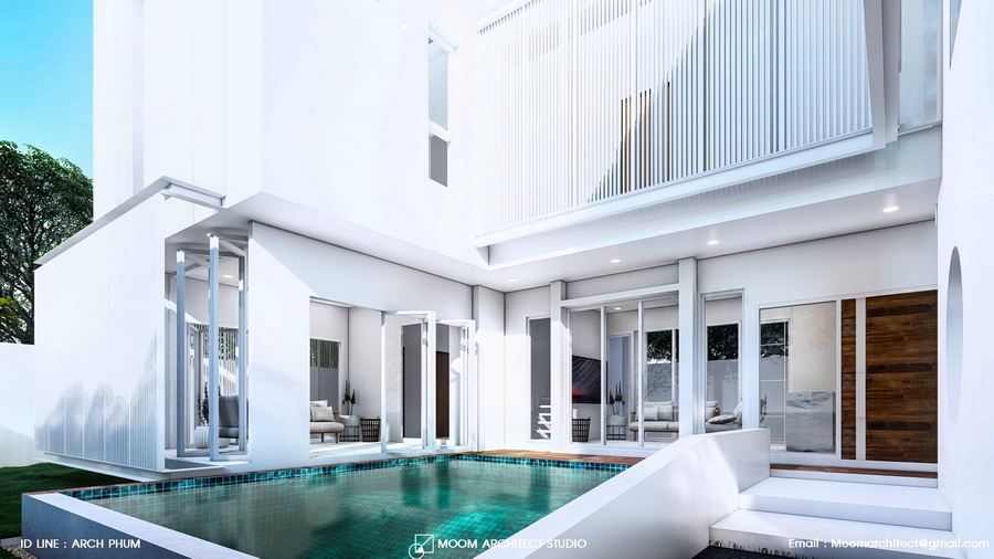 บริเวณพื้นที่หน้าบ้านมีสระว่ายน้ำส่วนตัวในขนาดท่พอเหมาะเอาไว้ด้วย โดยจะเชื่อต่อกับพื้นที่ห้องโถงนั่งเล่นภายในบ้าน จึงเป็นบริเวณเพื่อการพักผ่อนหย่อนใจโดยเฉพาะ