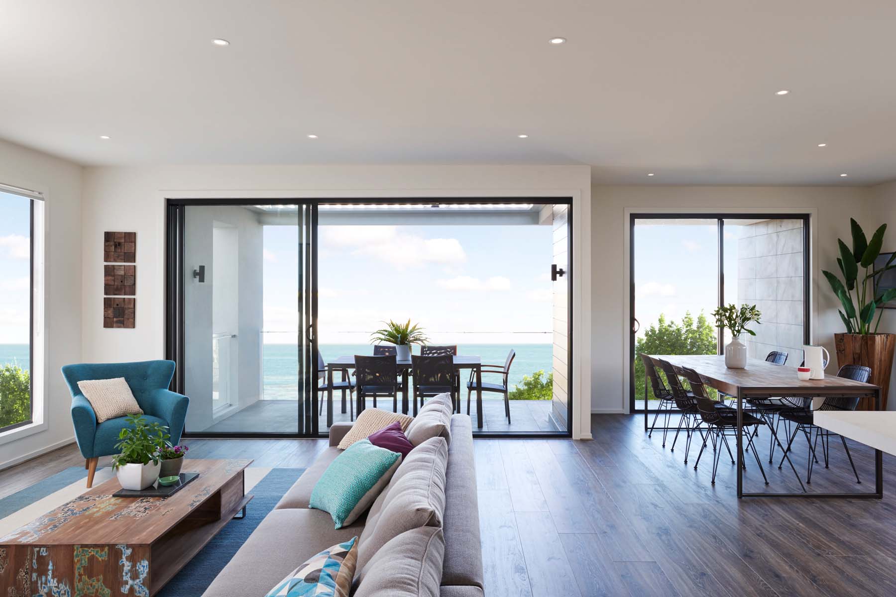ด้านข้างของตัวบ้านถูกออกแบบให้เป็นประตูบานเลื่อนแบบกระจกใส ซึ่งให้วิวทิวทัศน์ภายนอกบ้านได้อย่างชัดเจน พร้อมกับมีพื้นที่ให้นั่งเล่นด้านนอกอีกด้วย