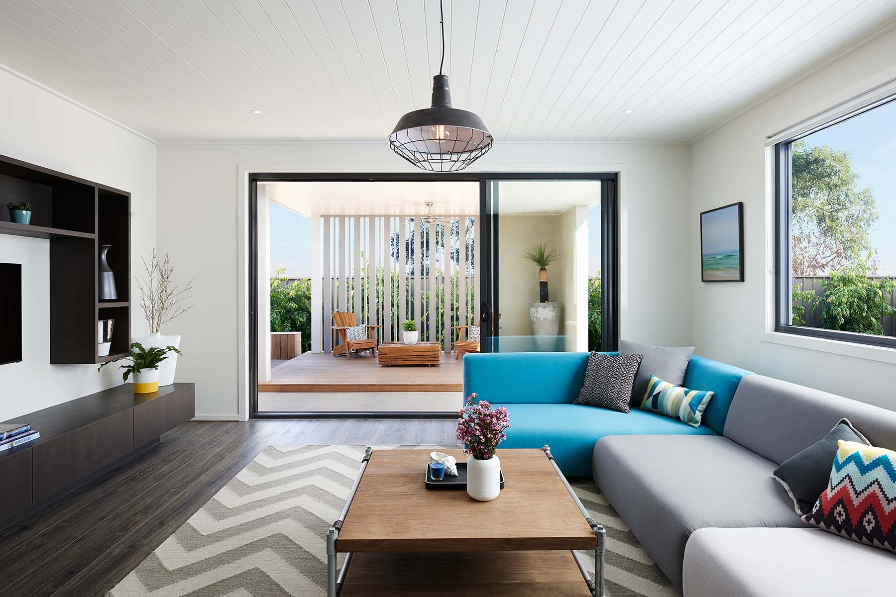 ภายในห้องนั่งเล่นจะมีรูปแบบการตกแต่งที่ยังคงดูโมเดิร์น โทนสีภายในก็จะยังคงมีโทนสีขาว เทาและน้ำตาลเช่นเดียวกันกับภายนอกบ้าน จึงให้โทนสีห้องที่ดูสว่างเป็นพิเศษ