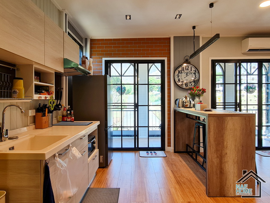 สำหรับมุมนี้เป็นห้องครัวของบ้าน โดยถูกออกแบบและตกแต่งในสไตล์โมเดิร์น มีองค์ประกอบและฟังก์การใช้งานที่ครบครัน