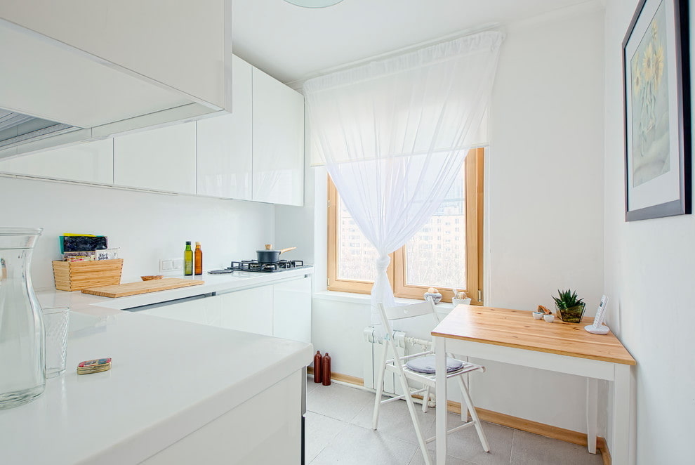 เฟอร์นิเจอร์ในห้องครัวที่เลือกใช้ควรจะเป็นแบบลอยตัว รูปทรงสีสันเรียบง่าย และมีเส้นสายที่มั่นคงแข็งแรง ซึ่งควรจะเลือกเท่าที่จำเป็นเท่านั้น ไม่ควรจัดเฟอร์นิเจอร์จำนวนเยอะจนเกินไปเพราะอาจจะทำให้การทำงานในห้องครัวไม่สะดวกเท่าที่ควรจะเป็น
