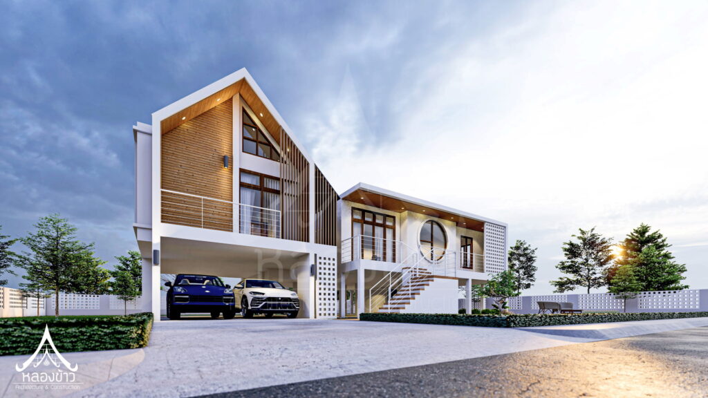บ้านหลังนี้เป็นบ้านขนาดชั้นครึ่งที่มีใต้ถุนยกขึ้นสูง ตัวบ้านมีขนาดใหญ่จึงมีพื้นที่ใช้สอยที่กว้างขวางเพื่อรองรับครอบครัวใหญ่ ก่อนที่เราจะไปพูดถึงรายละเอียดสไตล์นอร์ดิกผสมกลิ่นอายญี่ปุ่นนั้น เราจะเห็นพื้นฐานรูปทรงบ้านที่มีกลิ่นอายและเส้นสายที่คมชัดแบบโมเดิร์นเป็นพื้นฐาน