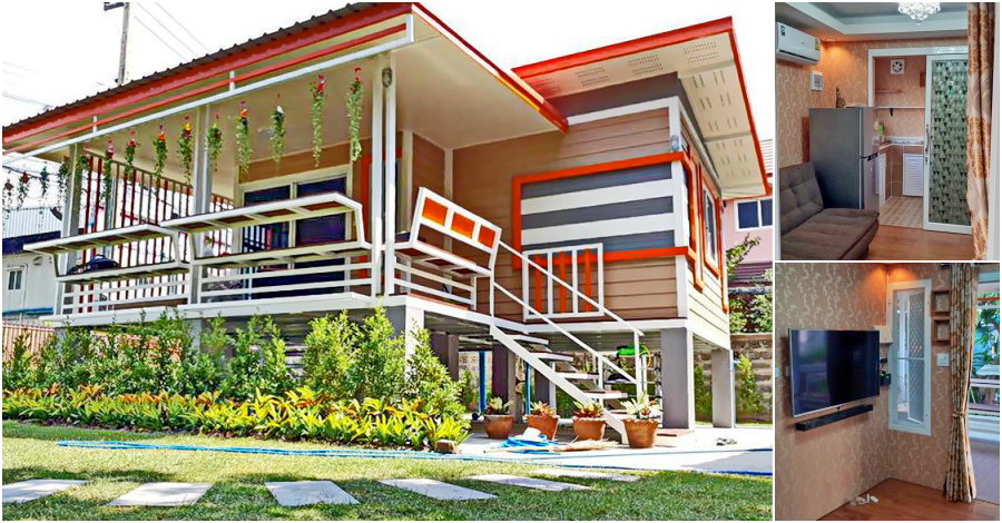 สำหรับบ้านหลังนี้เป็นบ้านขนาดชั้นเดียว ตัวบ้านมีขนาดพอเหมาะ ฐานของบ้านออกแบบยกใต้ถุนขึ้นสูง หลังคาทรงเพิงหมาแหงนผสานกับหลังคาแบบเรียบวัสดุเมทัลชีท ผนังภายนอกตกแต่งด้วยโทนสีครีมที่ให้กลิ่นอายแบบพาสเทล