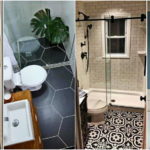 ห้องน้ำตกแต่งด้วยปูนเปลือย และปูพื้นด้วยกระเบื้องลายหินธรรมชาติ