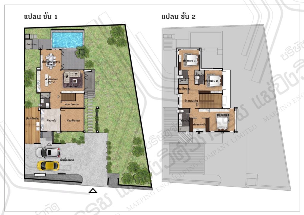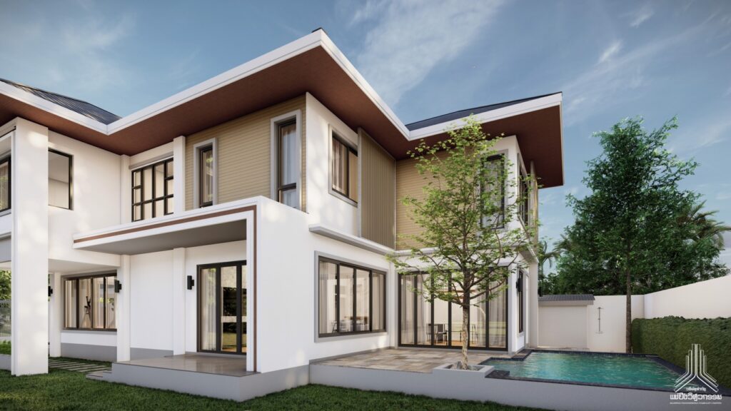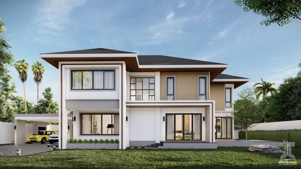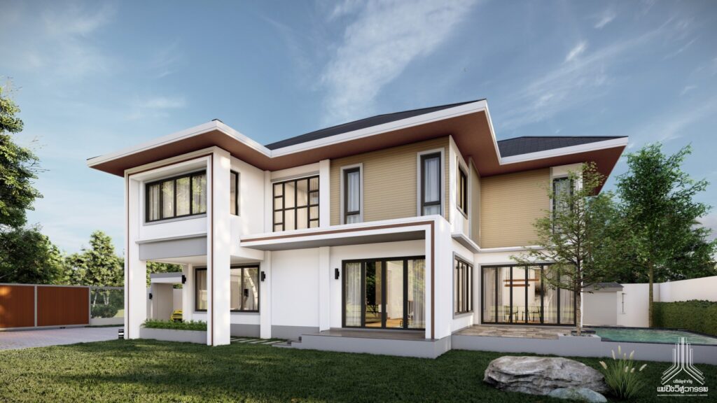 แบบบ้านสองชั้นสไตล์คอนเทมโพรารี ผลงานโดยทีมงานจาก บจก. แม่ปิงวิศวกรรม บ้านหลังใหญ่พื้นที่กว้างขวาง ดีไซน์หรูหราโอ่อ่า บนเส้นสายการออกแบบที่ดูเรียบร้อยสะอาดตา พร้อมด้วยสระว่ายน้ำส่วนตัวสำหรับช่วงเวลาของครอบครัวและการสังสรรค์