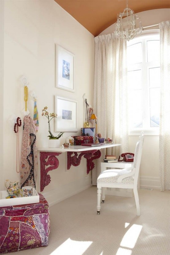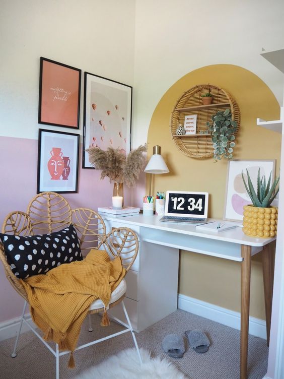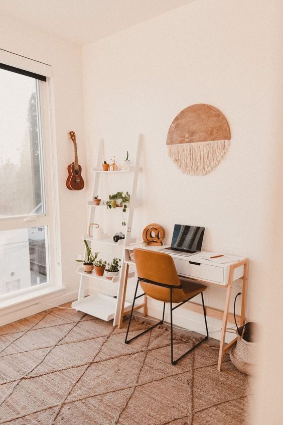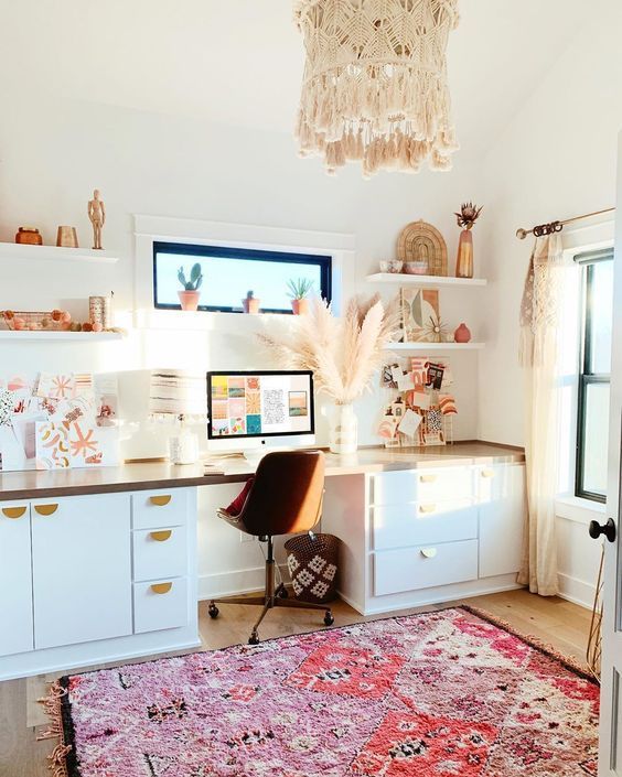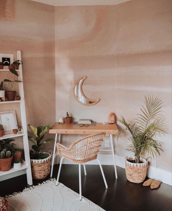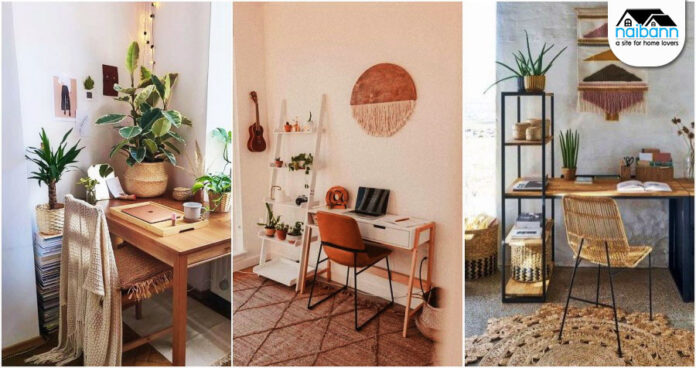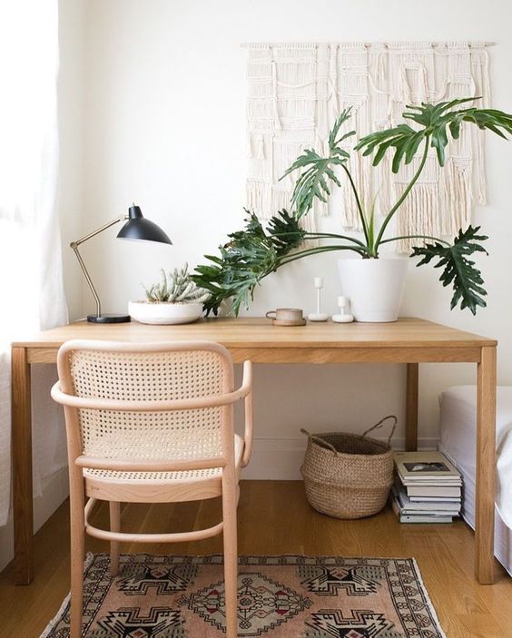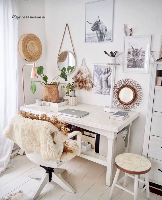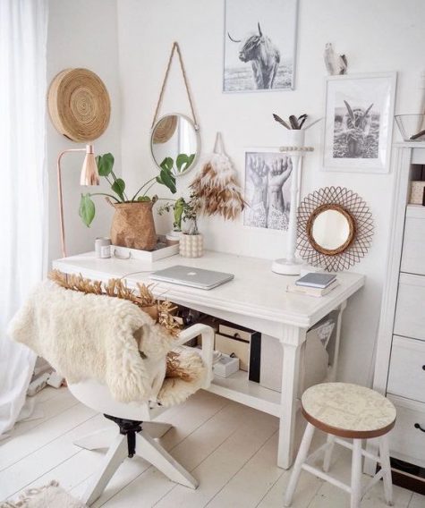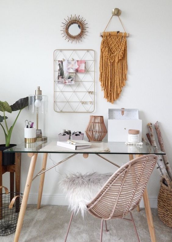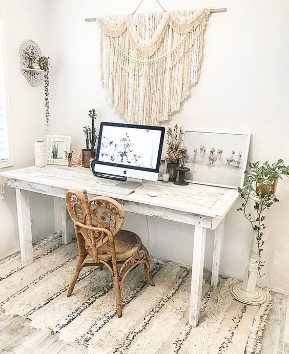 การตกแต่งโฮมออฟฟิศในสไตล์โบโฮชิค จะมีรายละเอียดของเฟอร์นิเจอร์หวาย อุปกรณ์ตกแต่งหวาย ผ้าไหมพรม พรมธรรมชาติ รวมไปถึงของตกแต่งแฮนด์เมดน่ารัก ๆ