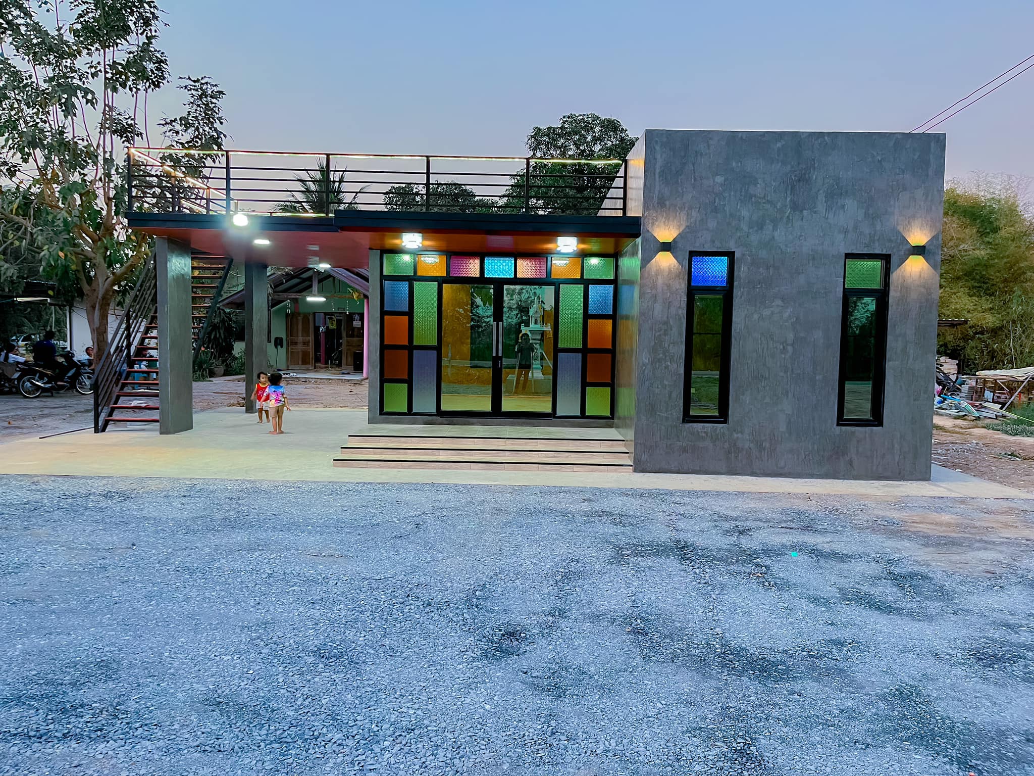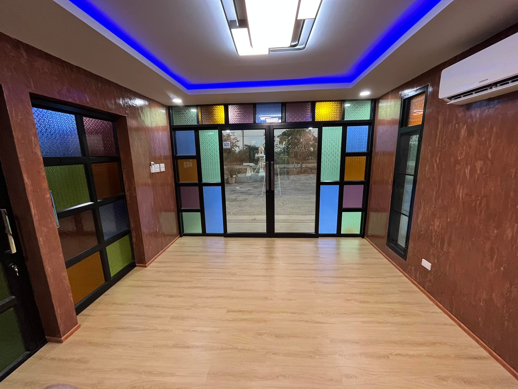 นอกจากนี้ที่ส่วนของประตูและหน้าต่างหน้าบ้าน เจ้าของยังเลือกใช้กระจกใสแบบสีสันต่าง ๆ อีกด้วย จึงให้ความสวยงามเพิ่มขึ้นได้ไม่น้อยเลย