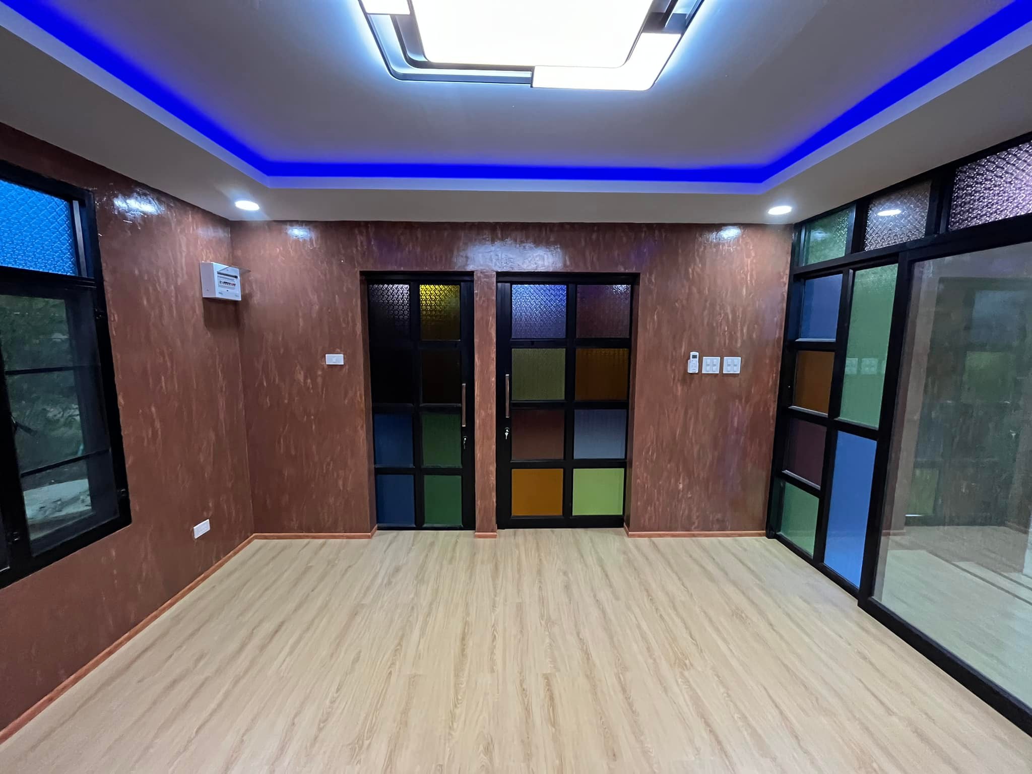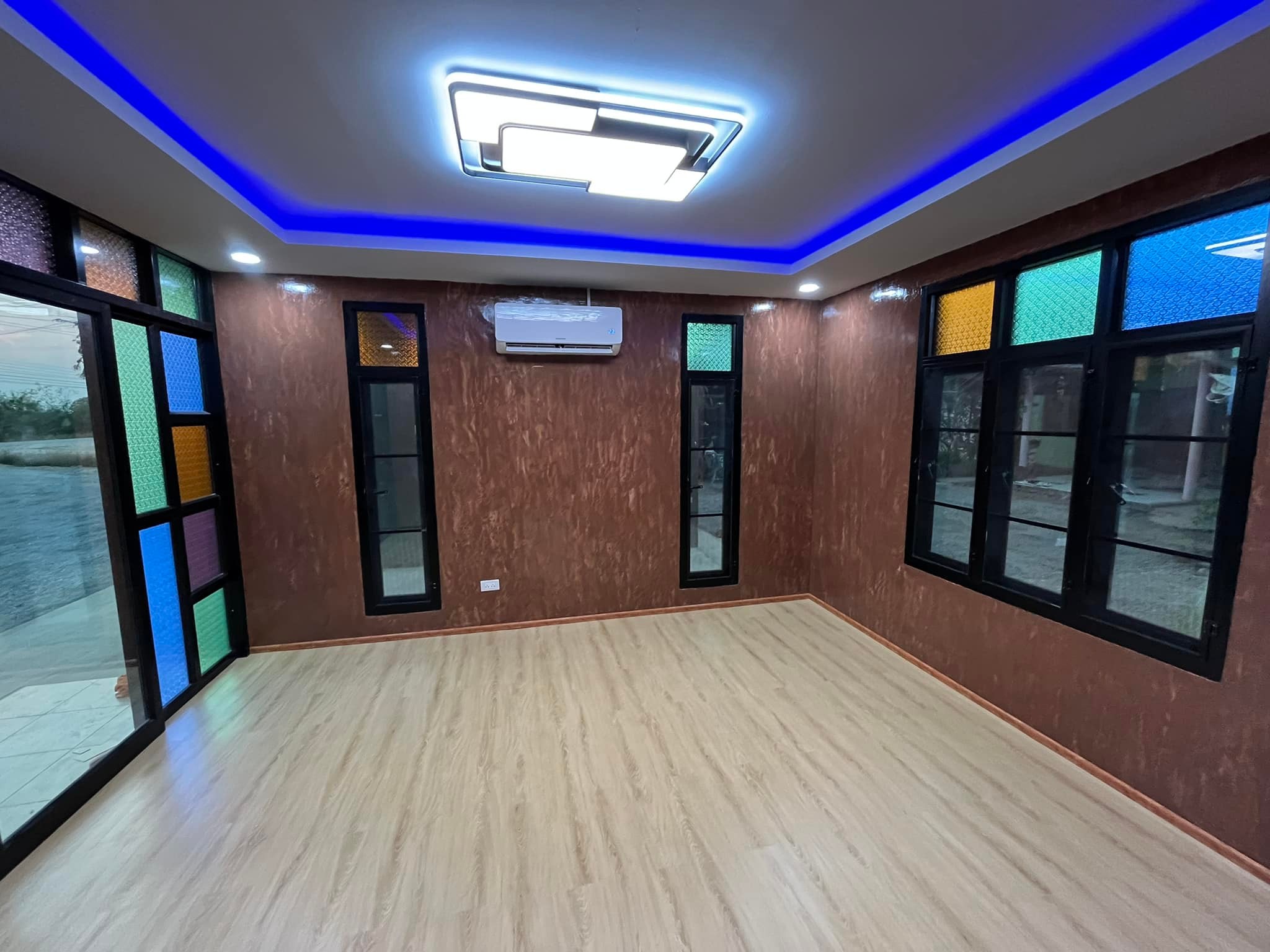 เมื่อเข้ามาภายในบ้าน เราก็จะพบกับห้องโถงกว้าง ๆ ซึ่งถูกตกแต่งด้วยหลวดไฟ LED สีสวย ซึ่งเข้ากันดีกับกระจกหลากสีสันของบ้านอีกด้วย