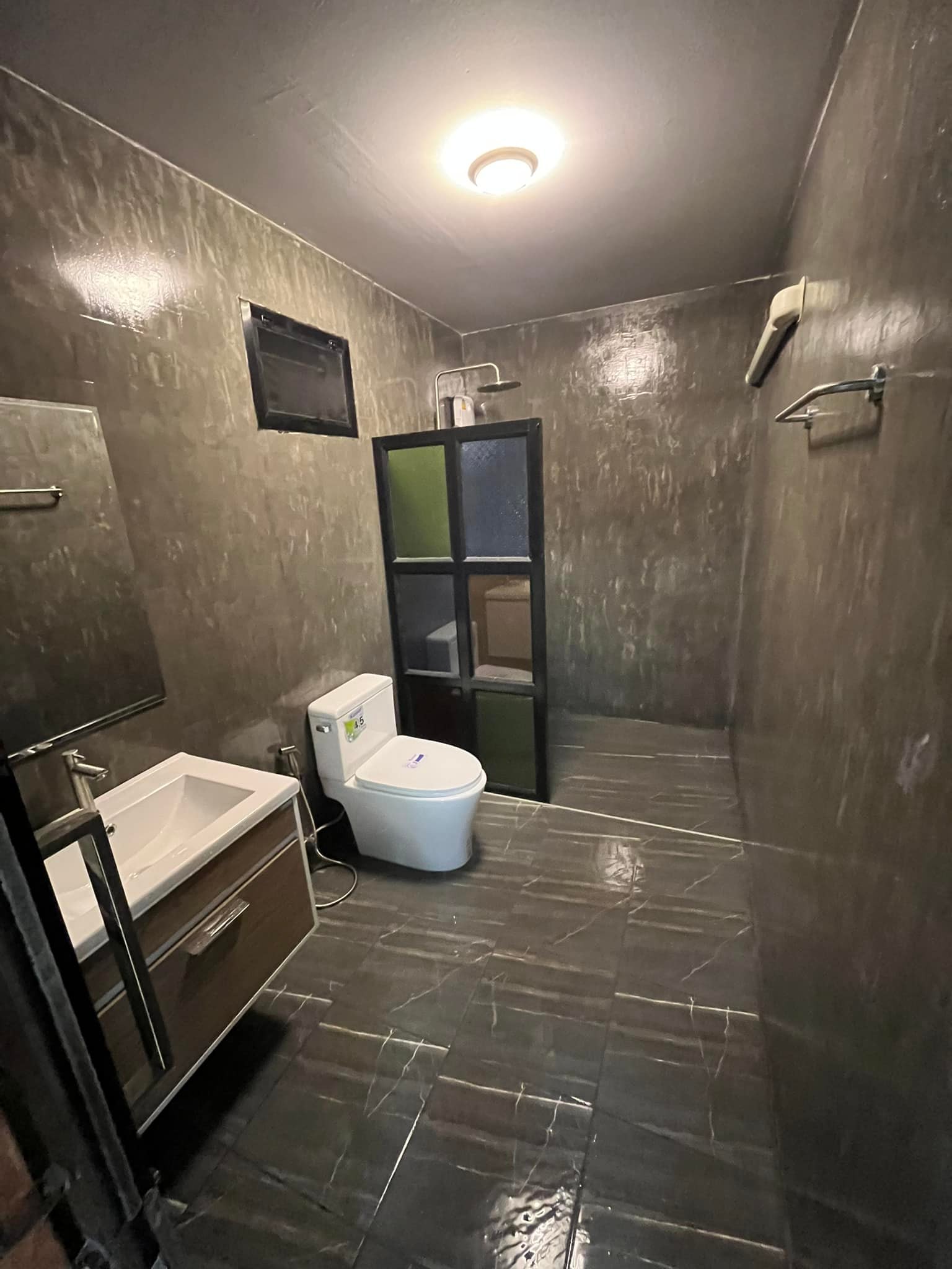 ภายในห้องน้ำ ถูกแบ่งพื้นที่ใช้สอยเอาไว้ได้อย่างเป็นสัดส่วน ผนังห้องตกแต่งด้วยผนังปูนเปลือยที่ให้ความสวยดิบไม่แพ้กับส่วนอื่น ๆ ของบ้านเลย
