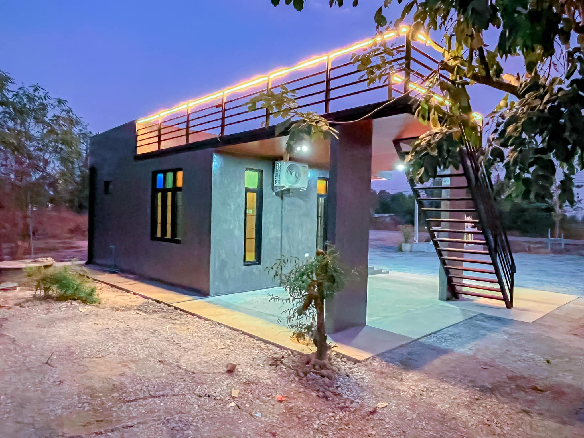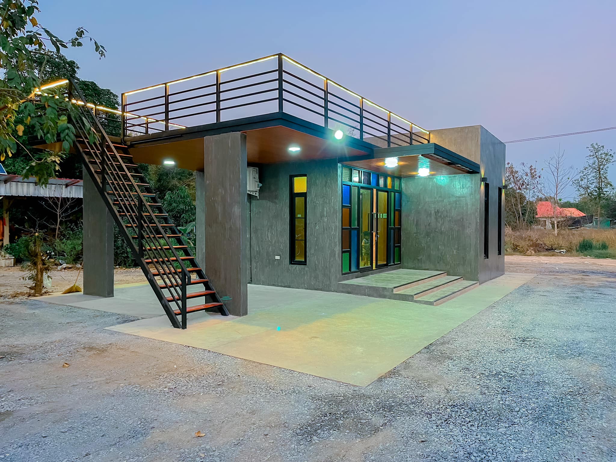 บ้านสไตล์โมเดิร์นลอฟท์หลังนี้ประกอบไปด้วย 1 ห้องนอน 1 ห้องโถง 1 ห้องน้ำ และดาดฟ้ากว้างขวาง งบก่อสร้างอยู่ที่ 450,000 บาท