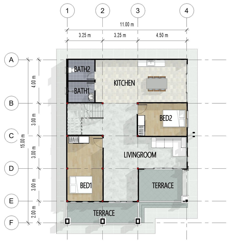 แบบบ้านสไตล์โมเดิร์นหลังนี้ประกอบไปด้วย 5 ห้องนอน 2 ห้องน้ำ 1 ห้องโถงนั่งเล่น 1 ห้องครัวพร้อมห้องรับประทานอาหาร 1 เฉลียงกว้างหน้าบ้าน งบก่อสร้างอยู่ที่ประมาณ 1.25 ล้านบาท