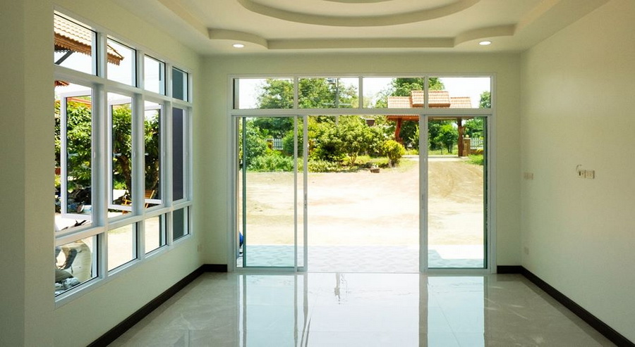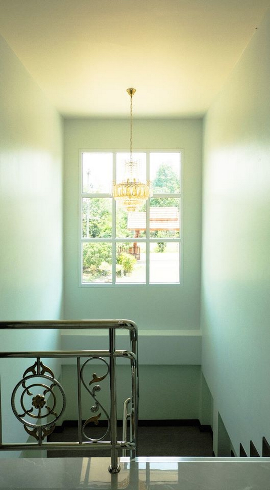ในส่วนห้องโถงตกแต่งในโทนสีขาวนวล สบายตา ด้านข้างเป็นผนังกระจกเปิดรับแสงธรรมชาติจากภายนอก ทำให้มุมมองภายในดูปลอดโปร่ง โล่งสบาย เหมาะสำหรับการต้อนรับแขก หรือนั่งเล่นพักผ่อนร่วมกับคนในครอบครัว
