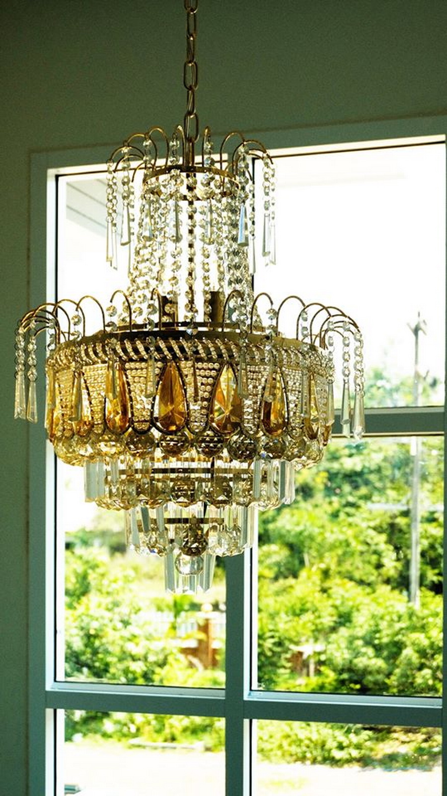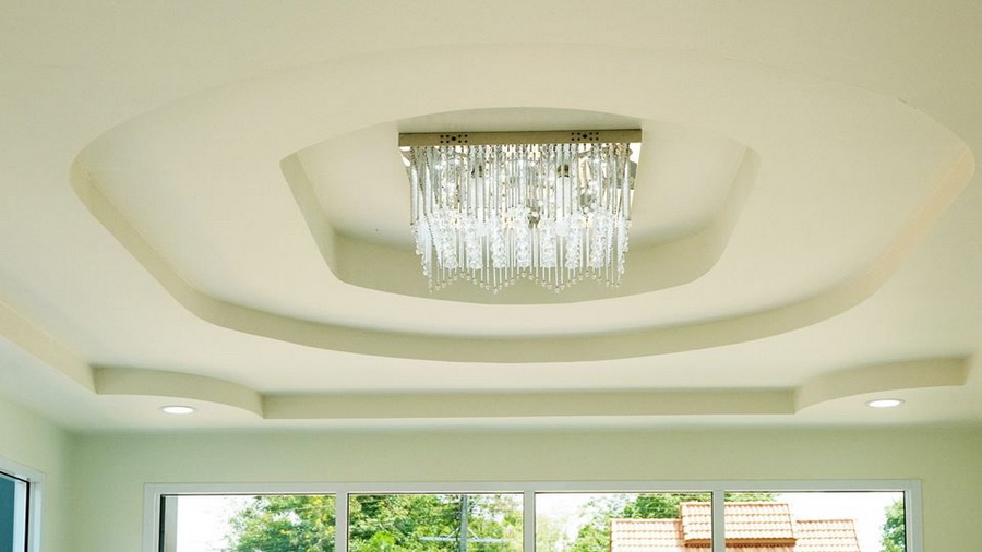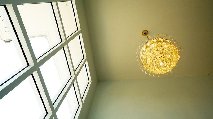 เพดานด้านบนเป็นแบบฝ้าหลุม หลายมิติ มีแชนเดอเลียให้ความสว่าง หรูหรา สวยงาม สร้างบรรยากาศในยามค่ำคืน